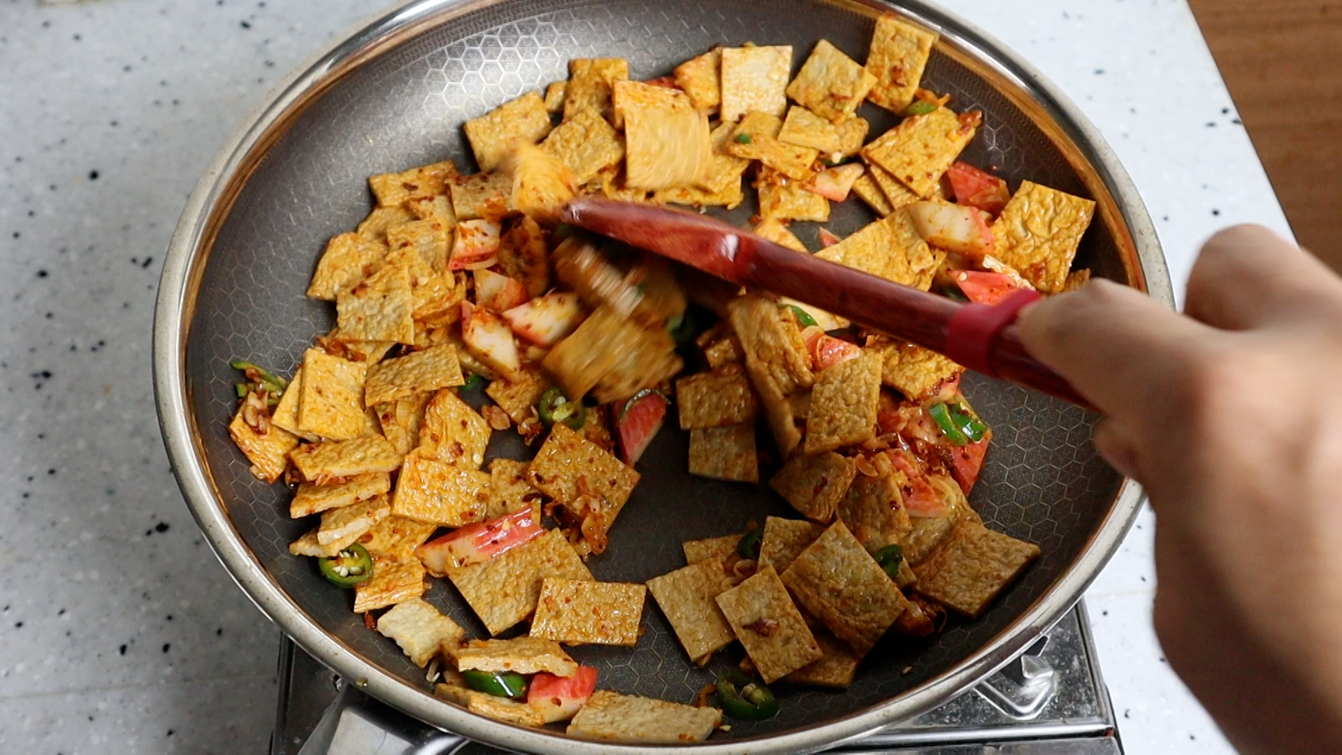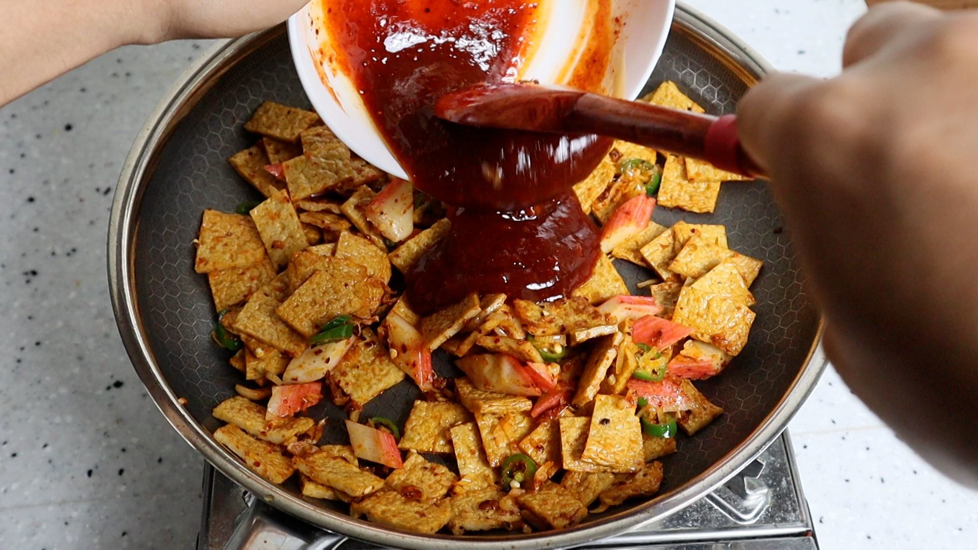 15. 기름에 어묵,맛살,땡초를 넣고 불은 중불로 올린 다음 대략 1분 30초 정도를 볶아주세요.