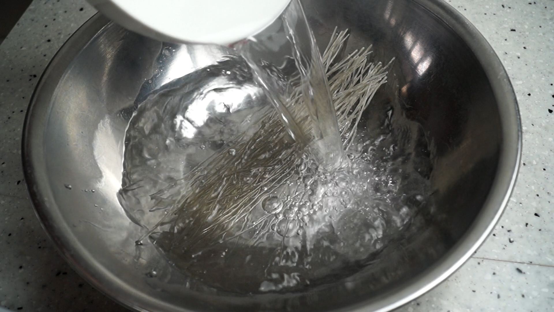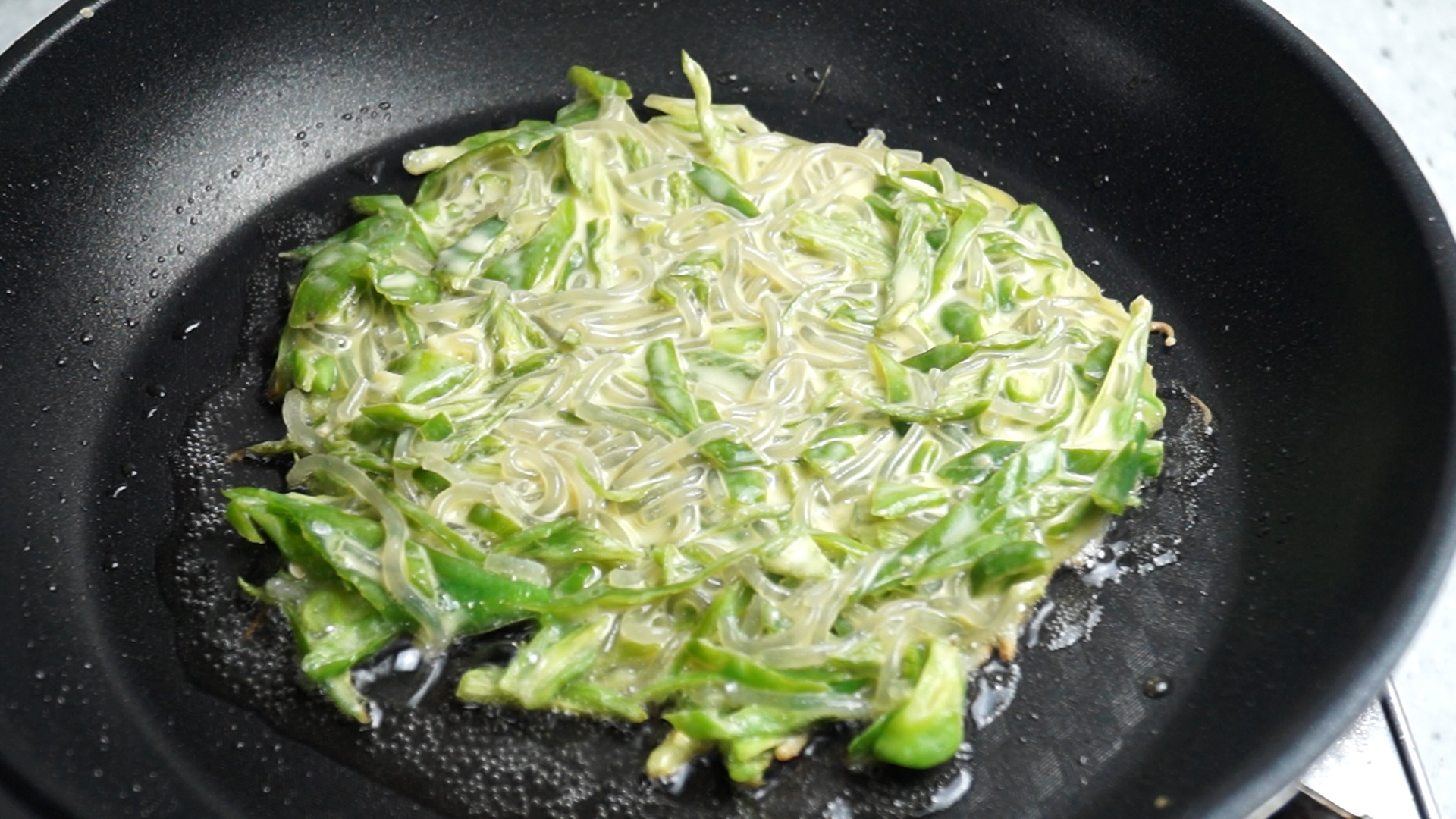 4. 물기뺀 불린 당면을 볼에 넣고 채썬 고추를 넣어주세요. 당면은 가위로 가위질을 해서 잘게잘게 잘라 주셔야 합니다.