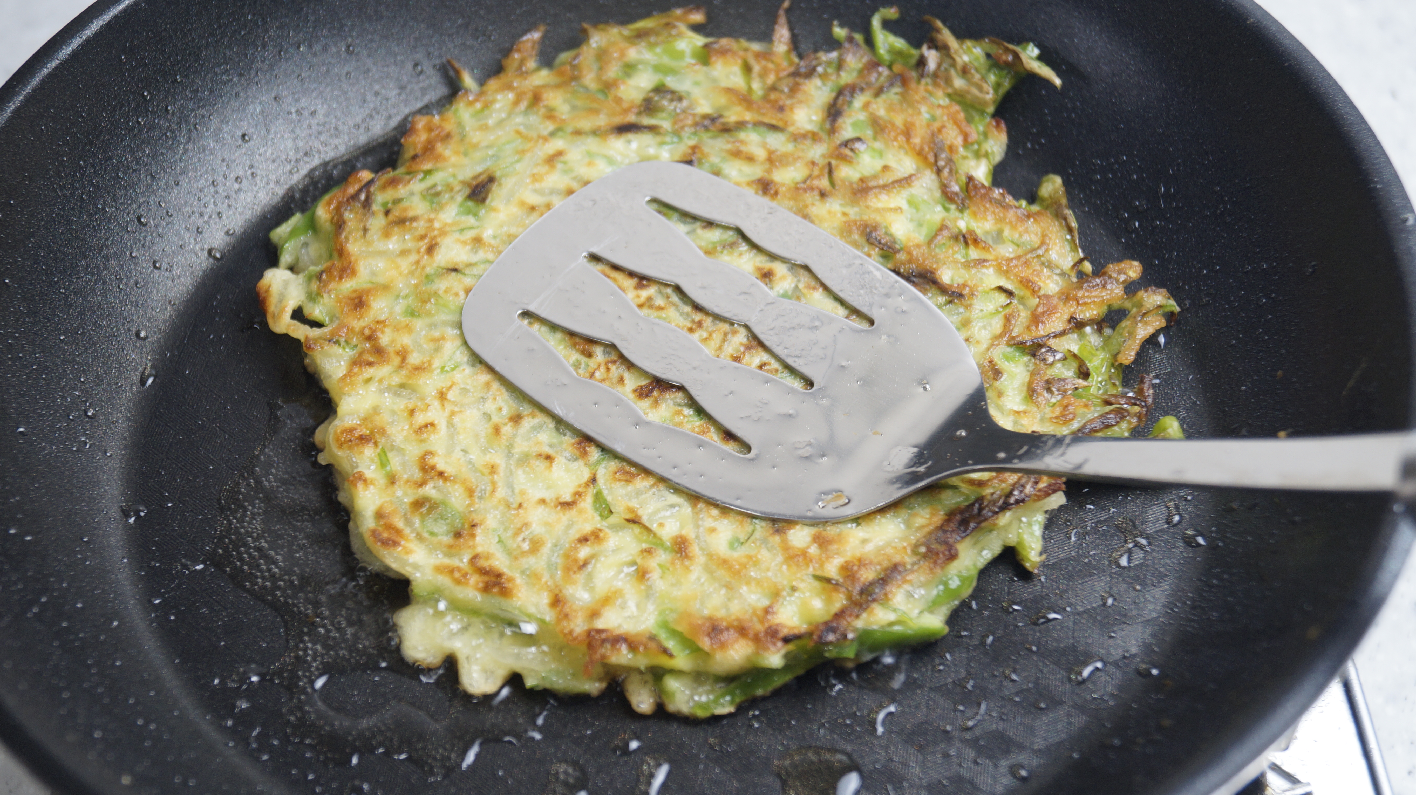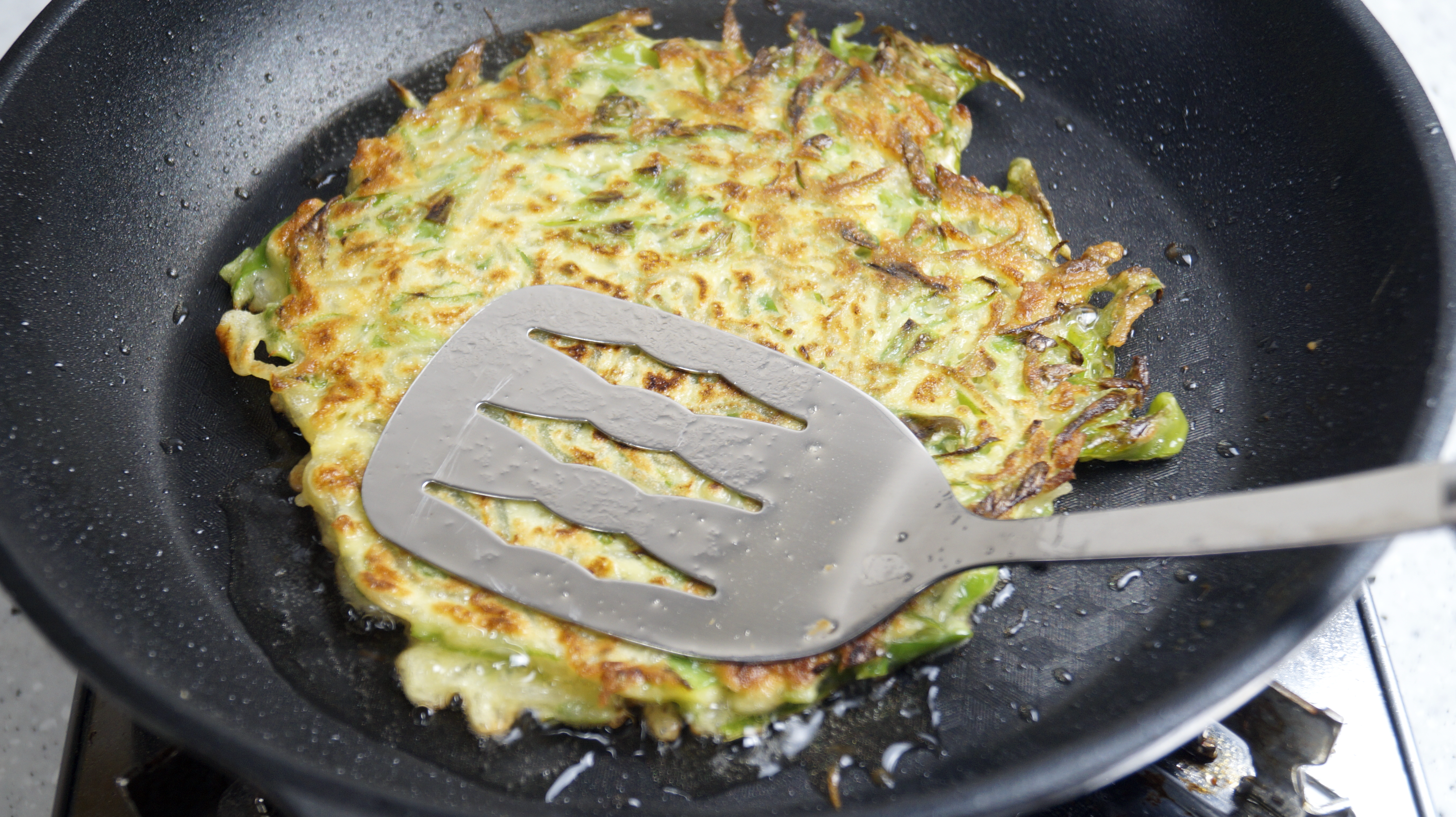 17. 1~2분에 한번씩 뒤집어 주시면서 대략 4~5분을 구워주세요. 뒤집을 때마다 살짝살짝 눌러 주시면 전이 좀더 얇고 넓게 펴질 뿐 아니라 아래 부분과 재료가 머금은 수분까지 배출되서 좀더 바삭한 전을 부칠수 있답니다.