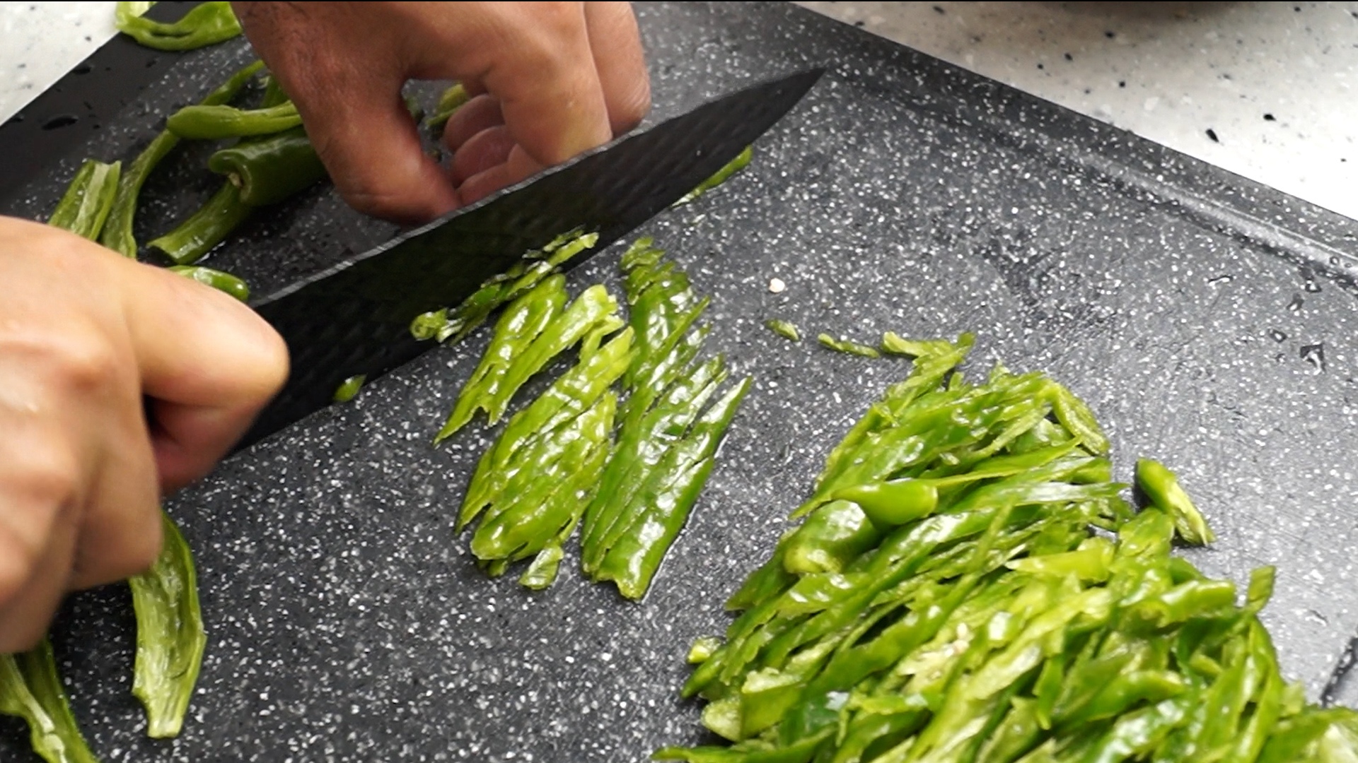2. 반으로 가른 고추를 사선으로 최대한 길쭉길쭉하게 채를 썰어주세요.