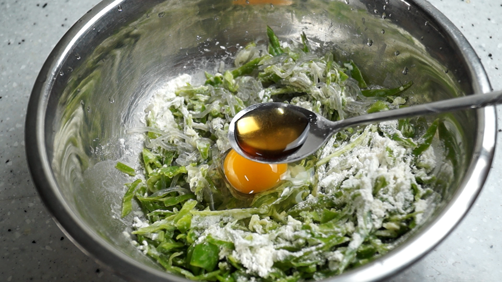 7. 계란 1알을 까넣고 멸치액젓 반스푼을 넣고 골고루 섞어주세요. 전부칠때 액젓을 조금씩 넣어주면 전맛이 훨씬 맛있어 집니다.