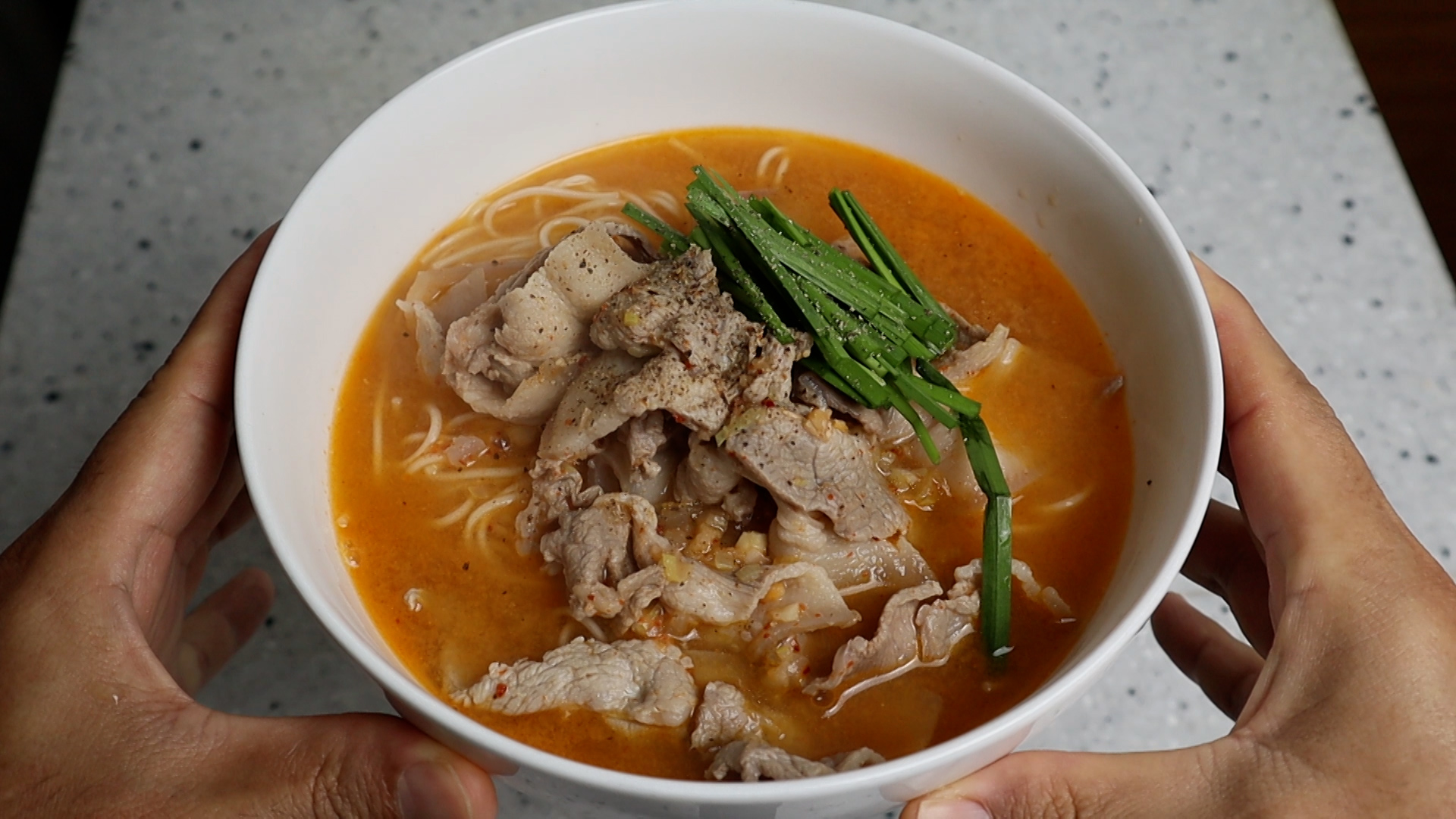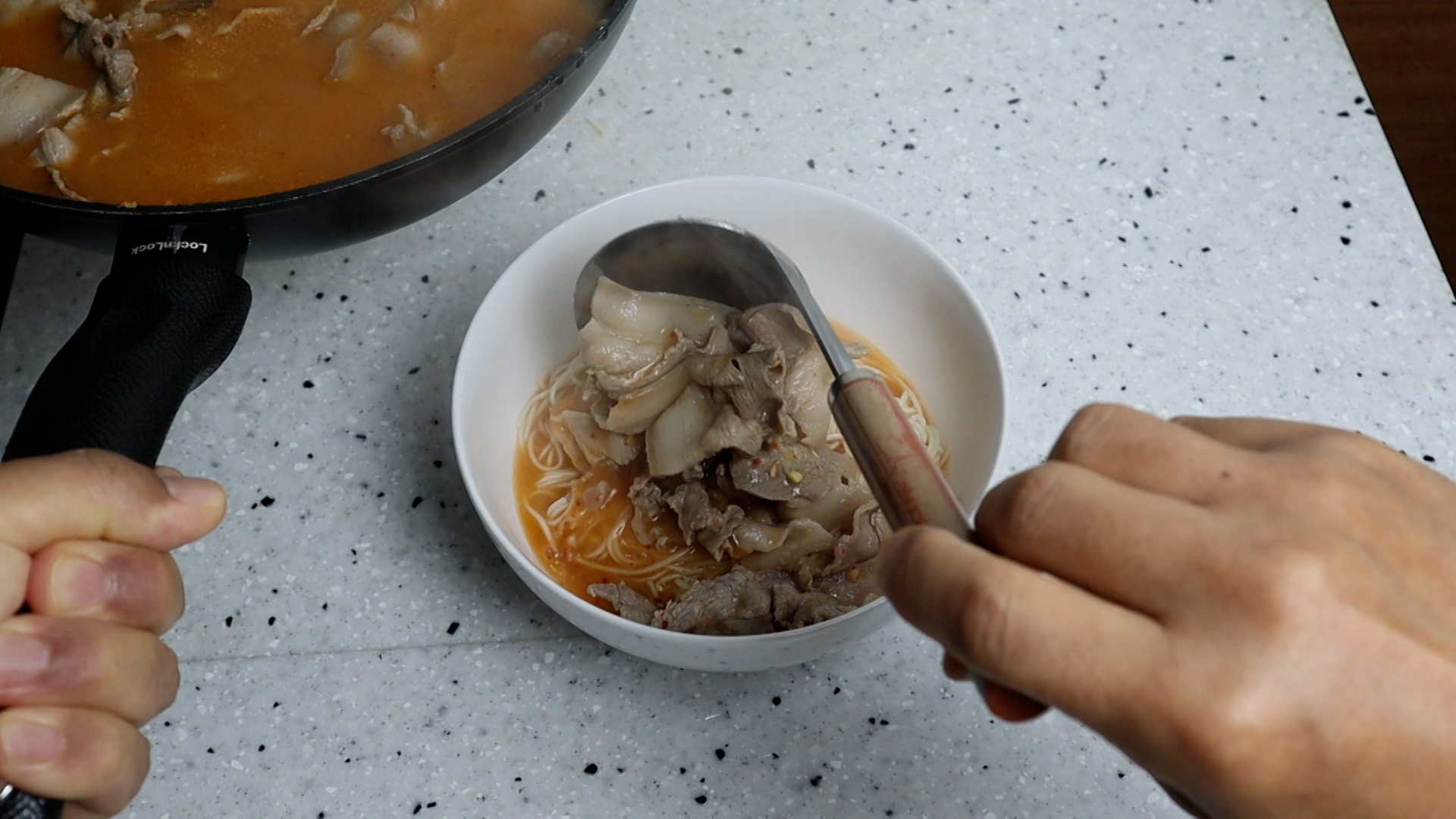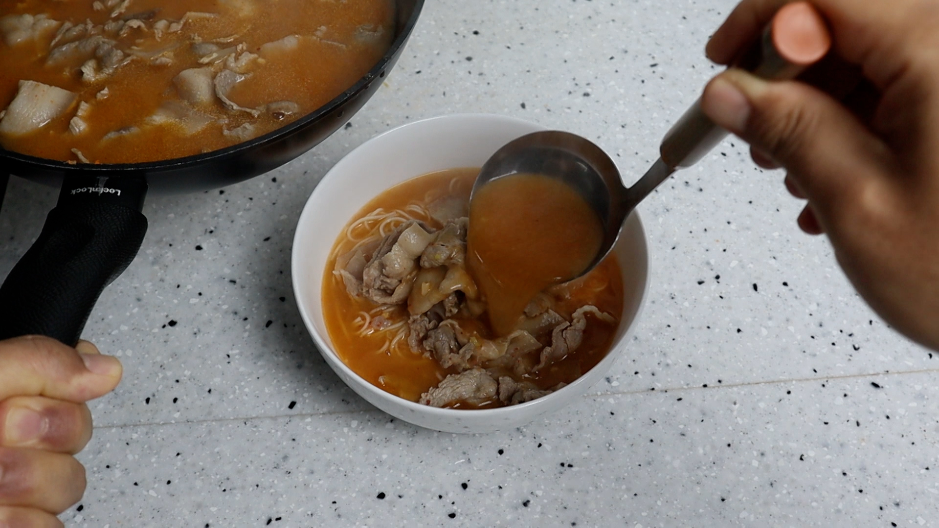 16. 고기를 듬뿍 얹어주고 국물도 넉넉하게 올려주세요. 2그릇 정도 만들수 있는 양이 나올거에요~
