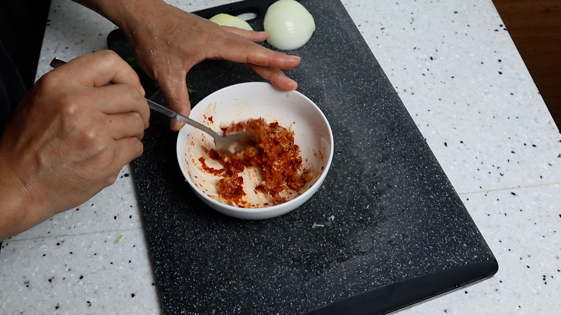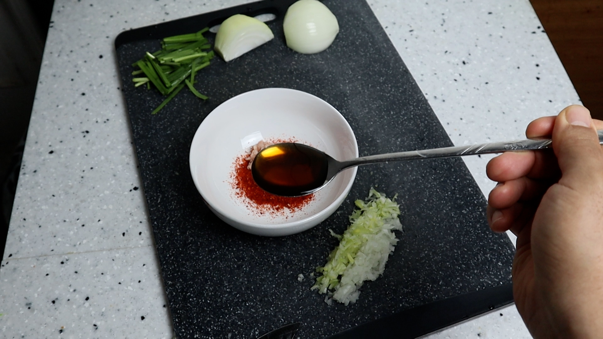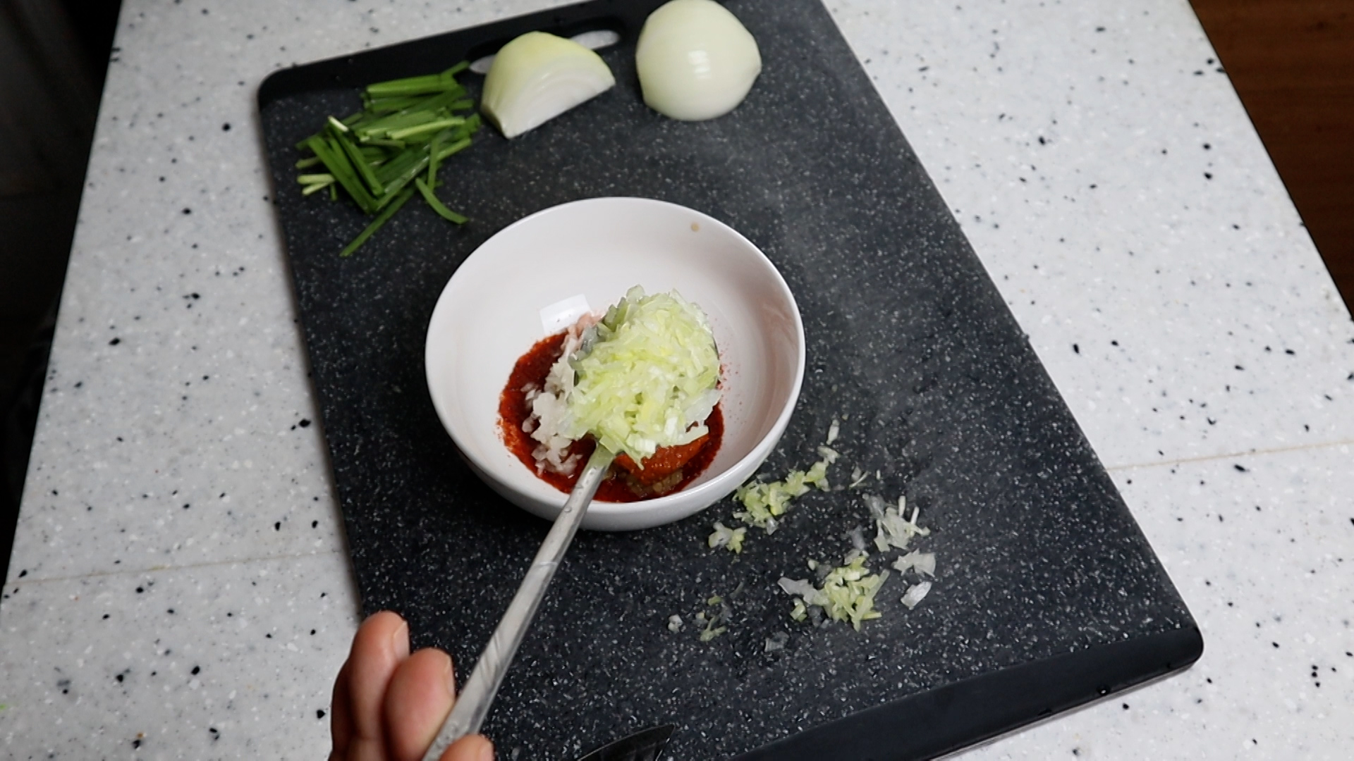 1. 양파를 크게 한큰술 나오는 양을 잘게잘게 다져서 준비해주세요.