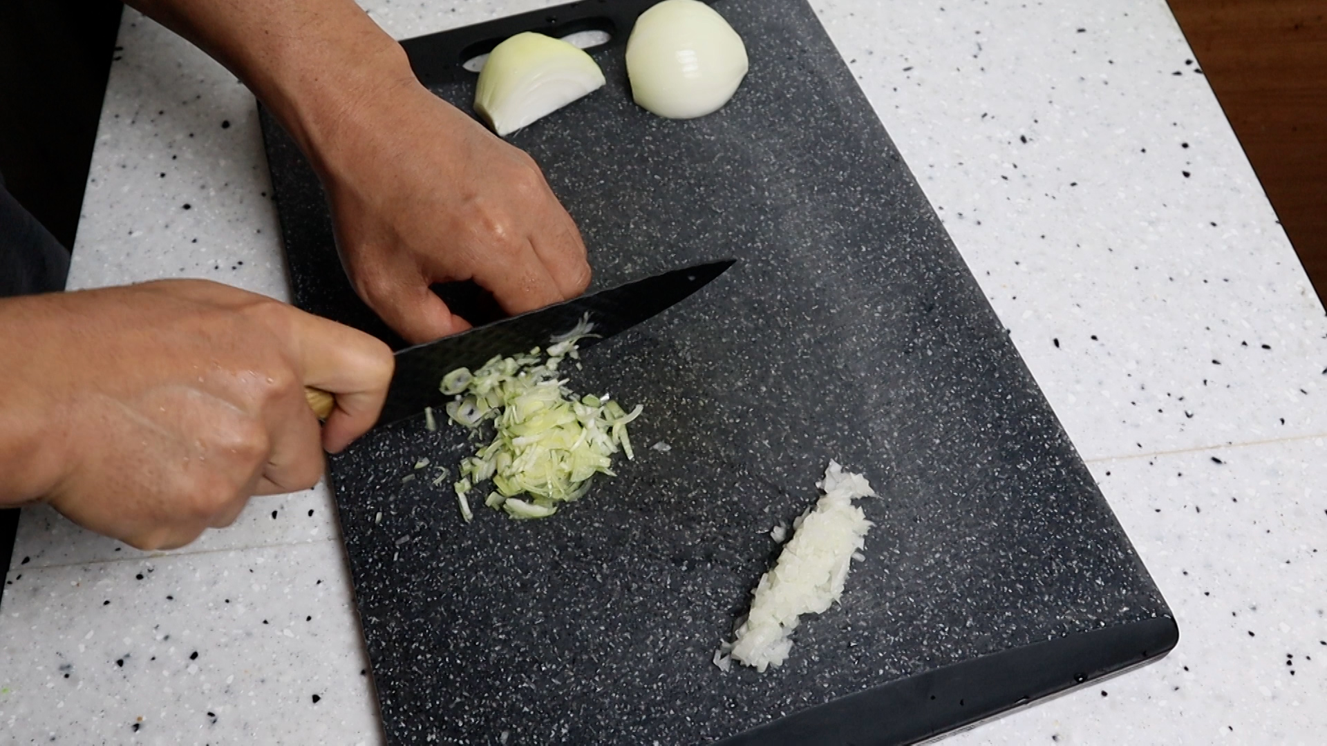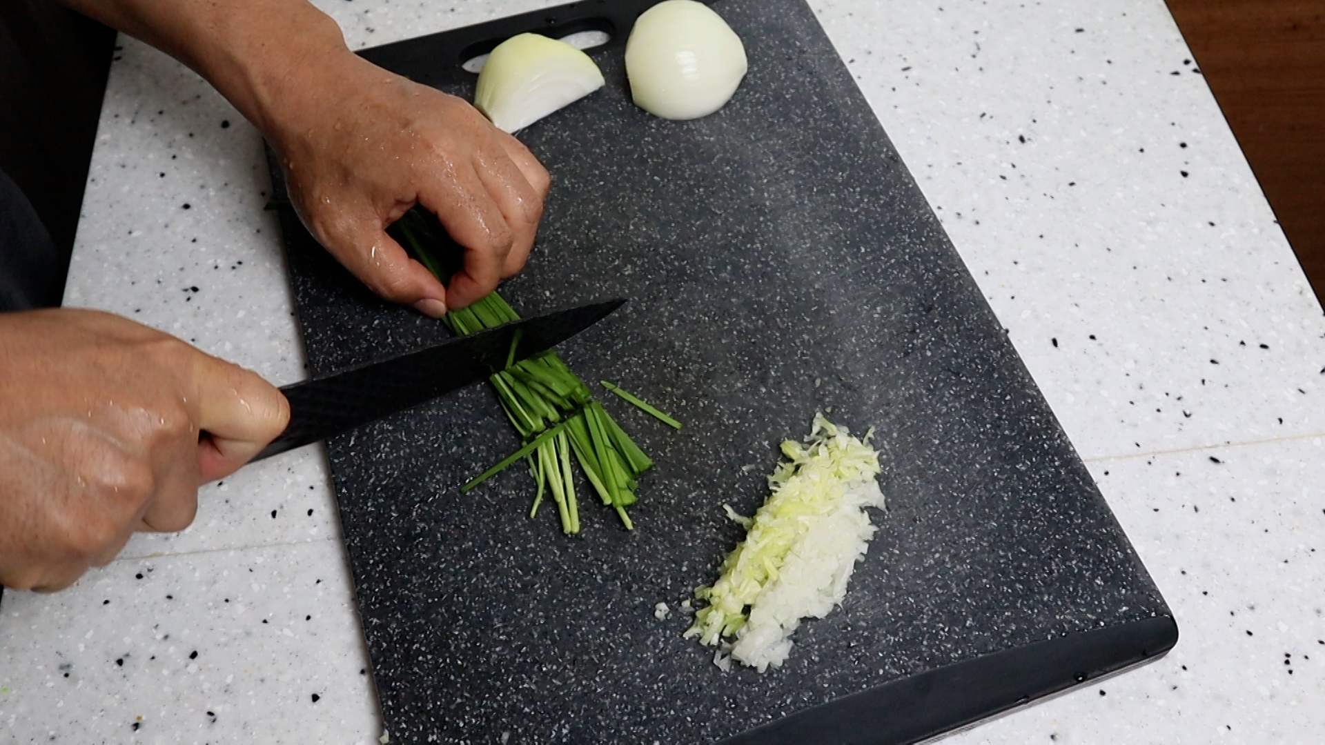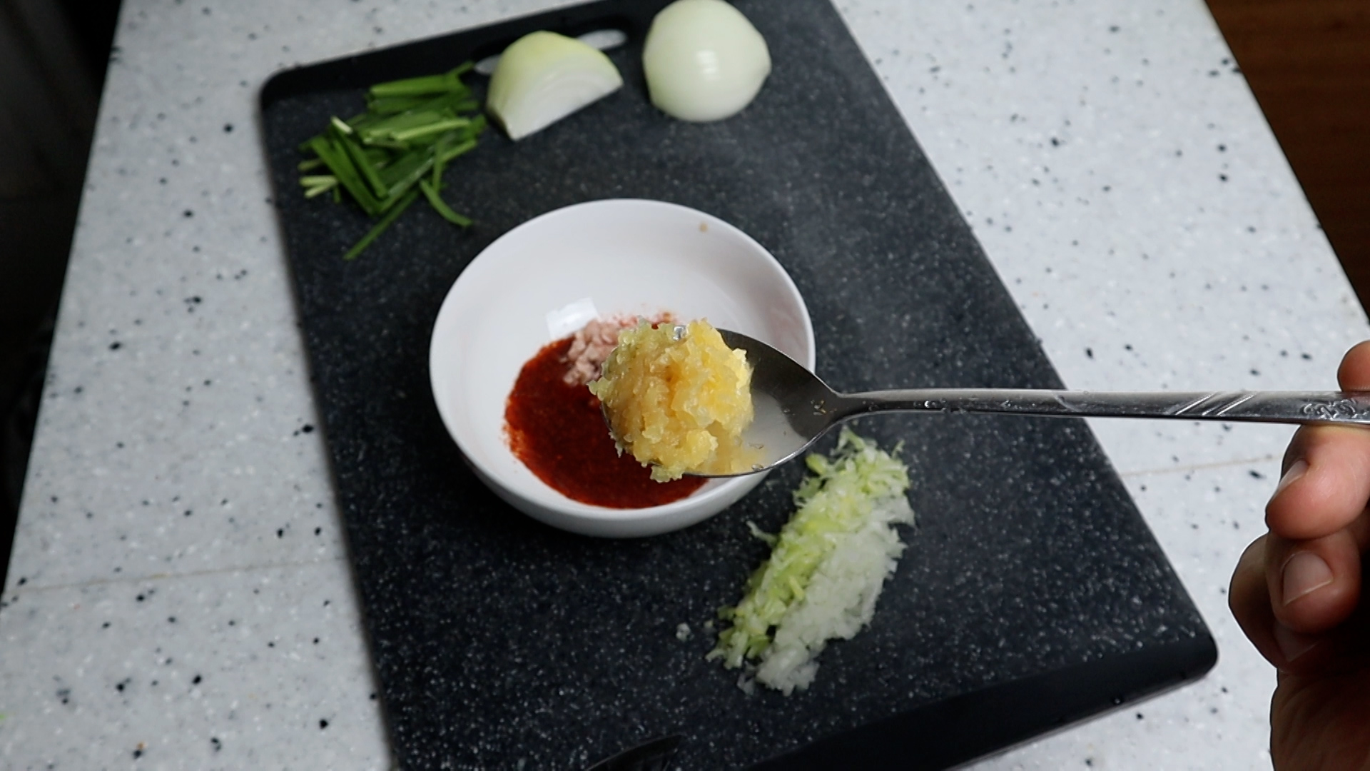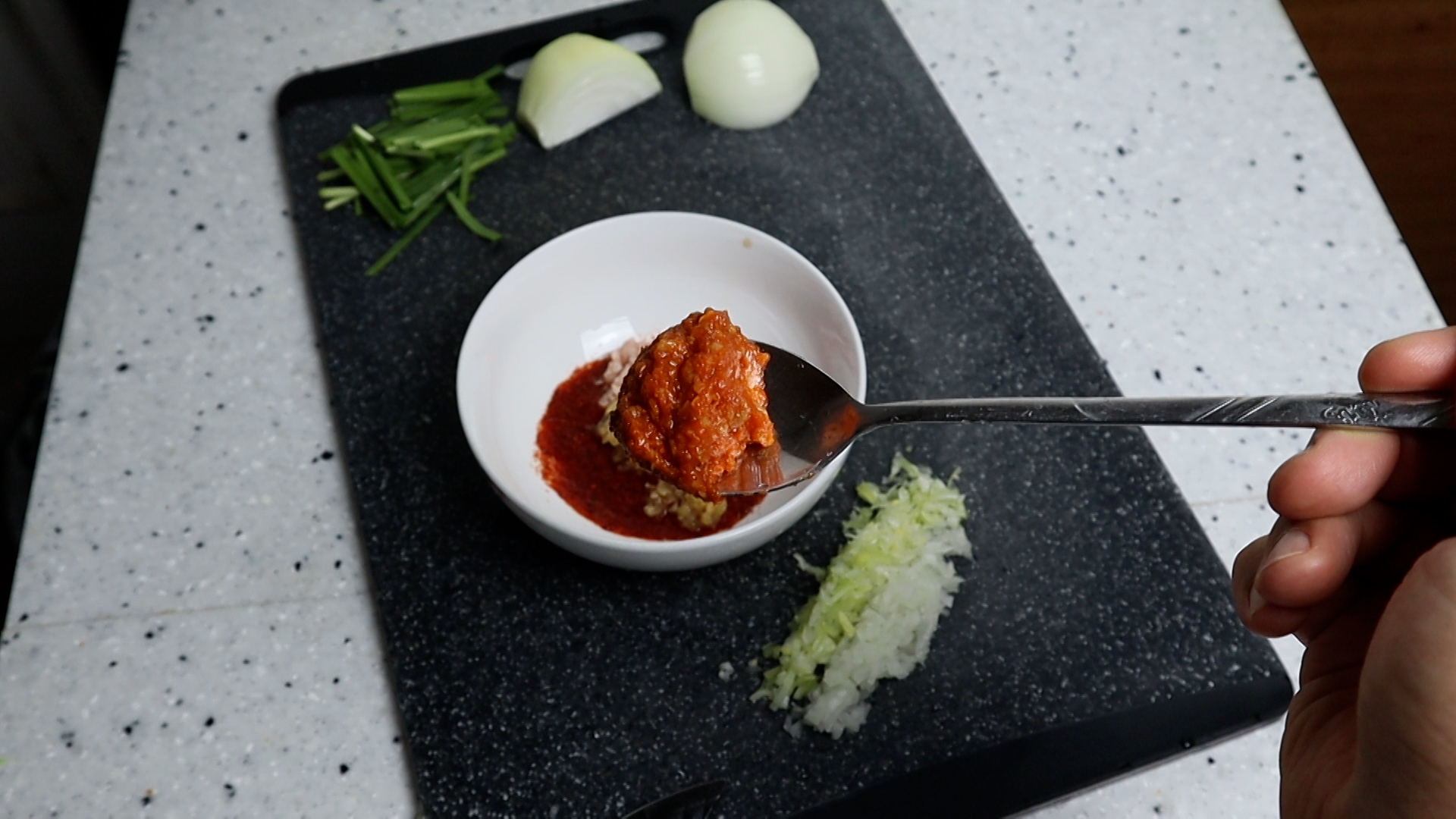 2. 대파도 크게 한큰술 나오는 양을 흰대 위주로 잘게 다져주세요. 양파와 같은 1큰술인데 무게가 다른 이유를 물어보시는 분들이 많던데 모든 물질은 고유한 밀도와 비중을 가지고 있는데 그게 차이가 나는거에요. 같은 부피라도 2리터의 물과 쇳덩이 2리터가 무게가 다른것과 같은 원리입니다.
