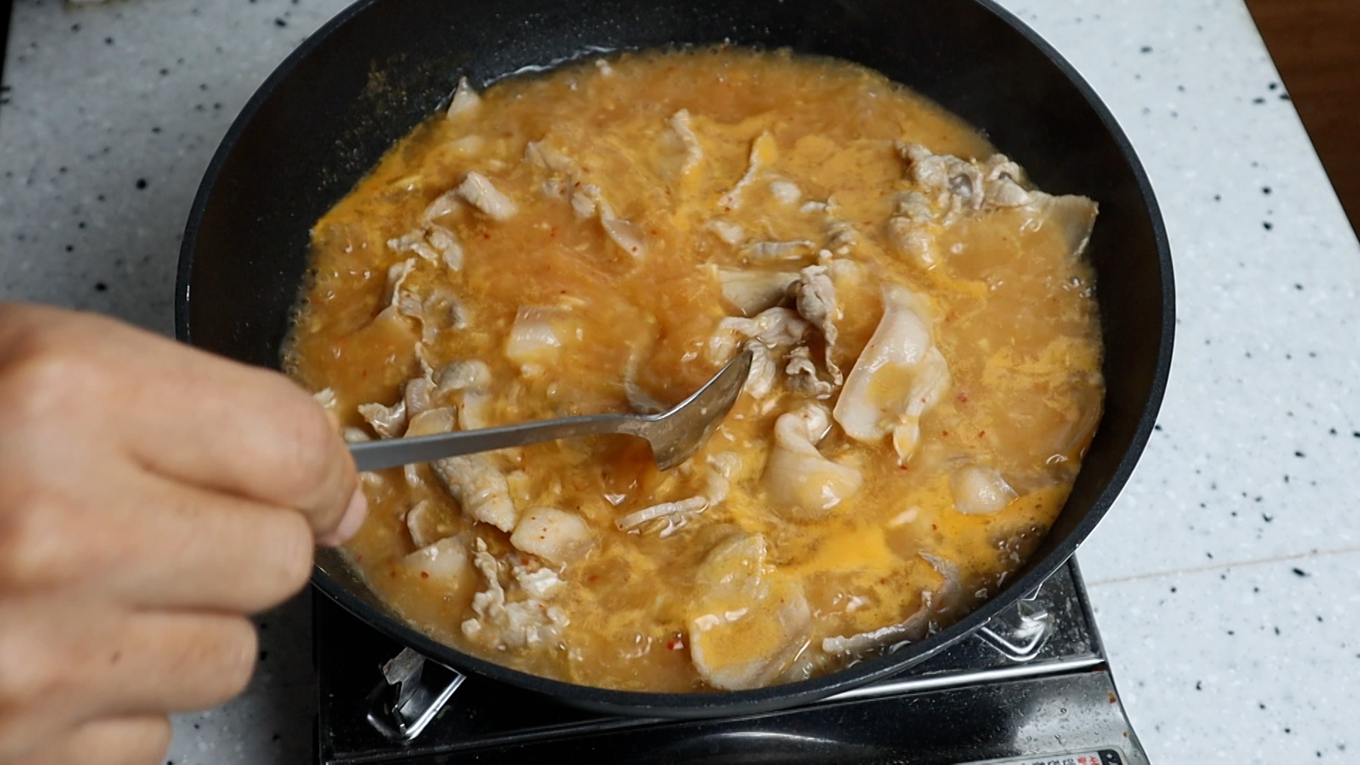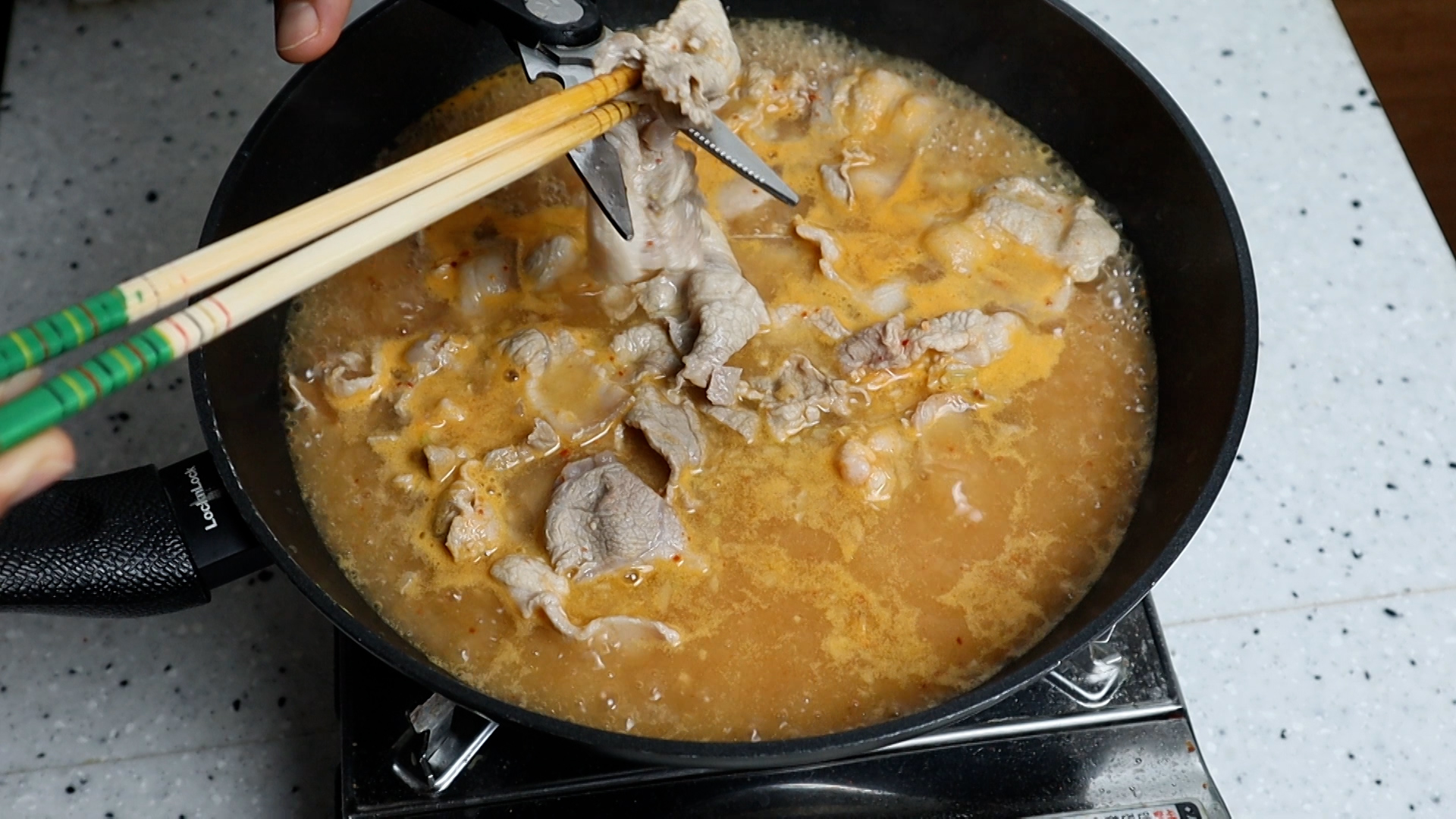 14. 육수가 끓기 시작해서 고기를 넣고 고기 자르는 시간 전부 포함해서 대략 5~6분 정도를 끓인 다음 맛을 보시고 추가간이 필요하면 양념을 더 넣어주세요.