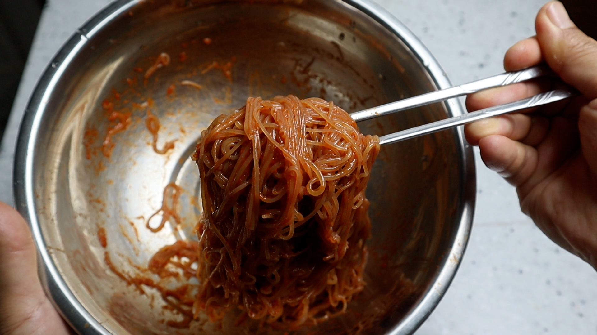 18. 참기름 반스푼 정도 부어주시고 적당한 힘으로 버무려주세요. 비빔면류는 젓가락으로 비비는것 보다 손으로 살짝살짝 눌러서 비비면 양념이 더 잘 베어서 좋더라고요^^