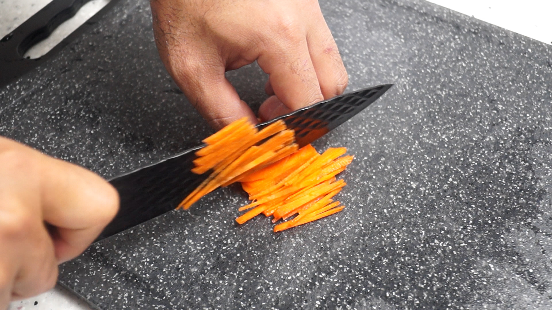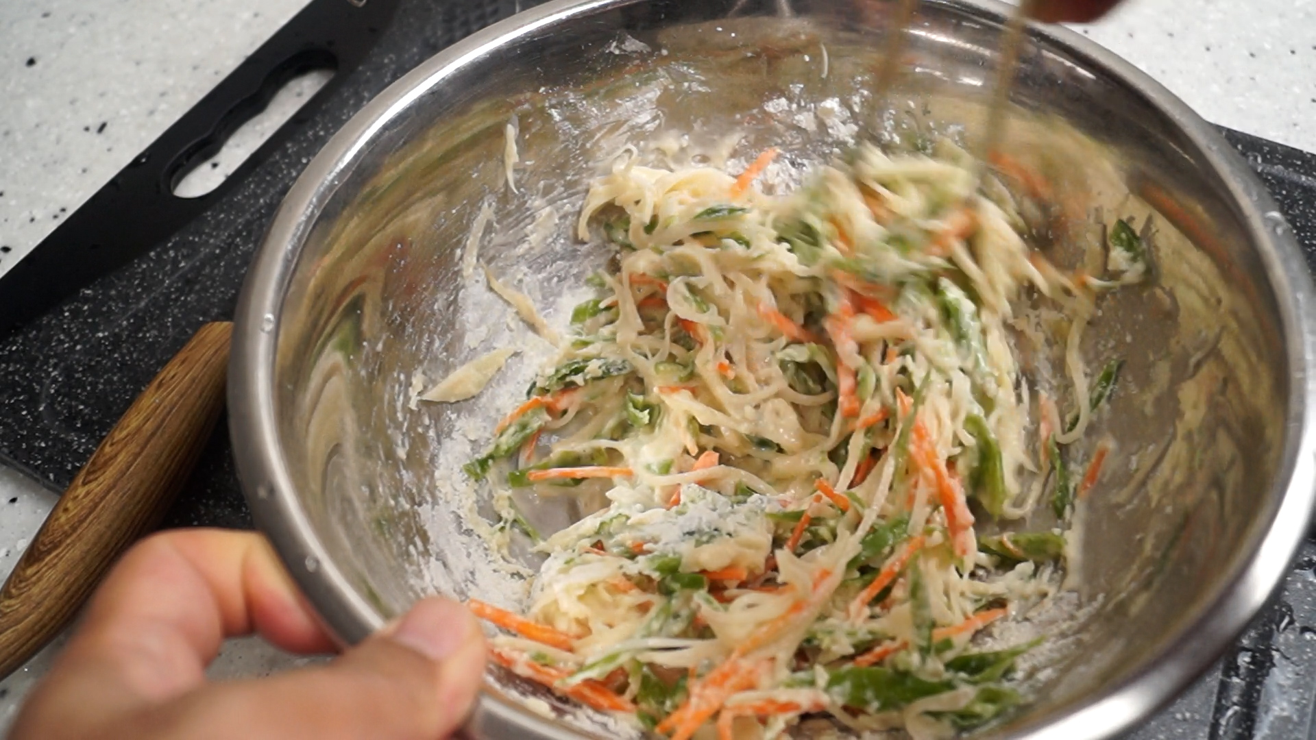 7. 당근도 감자처럼 얇게 채를 썰어주세요. 당근이 살짝 들어가면 전에 감칠맛이 살아서 넣어주시면 좋습니다.