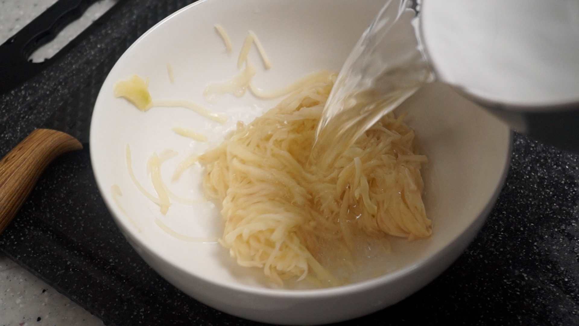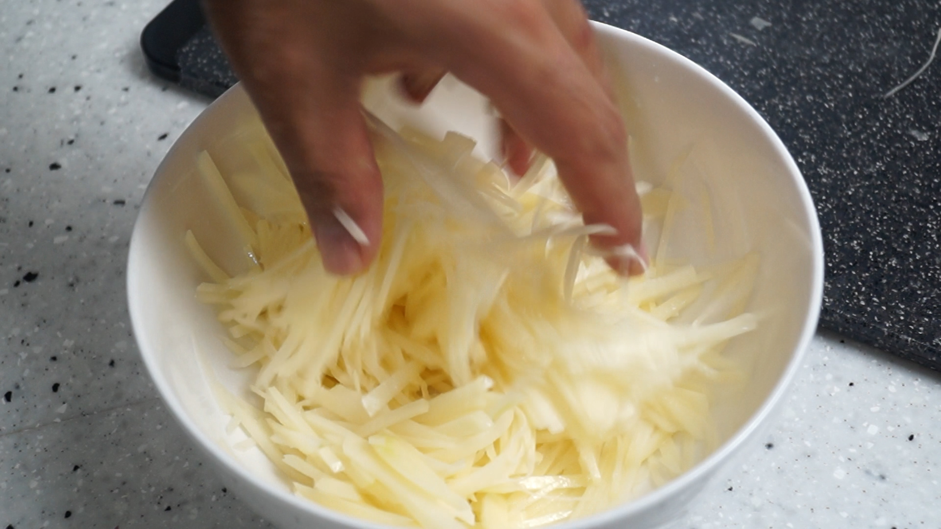 2. 껍질벗긴 감자는 1~2mm 로 얇게 채를 썰어주세요. 채써는게 힘드시면 채칼로 슥슥슥 밀어 주시는것도 좋습니다.