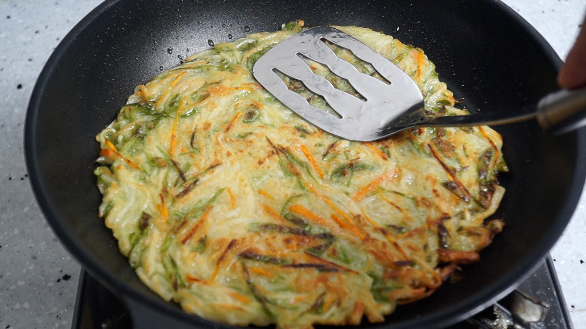 13. 대략 6~7분을 구워 주시면 노릇노릇하게 감자전이 구워졌을거에요.
