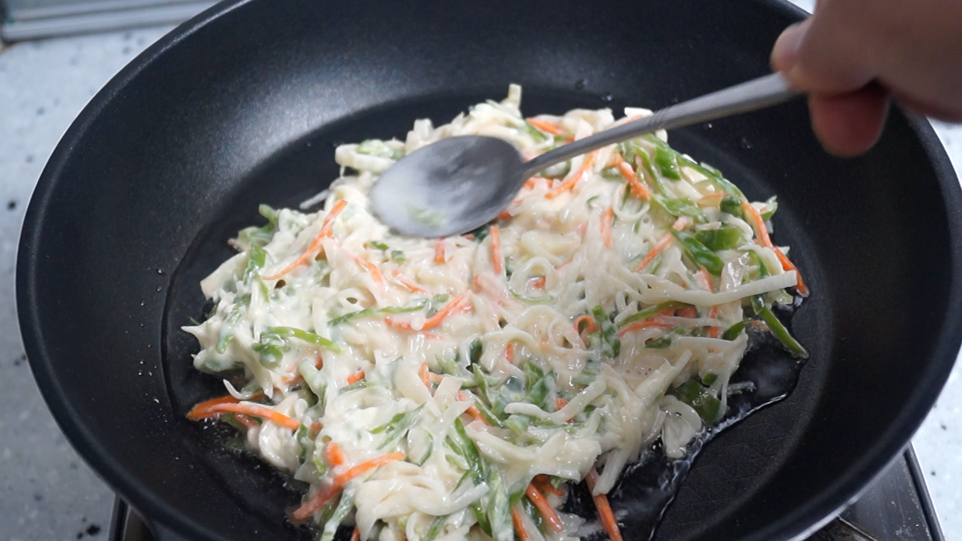 11. 팬에 기름을 넉넉하게 붓고 중불로 달궈 반죽을 넓게 펴 올려주세요. 반죽을 너무 두껍게 쌓으면 속이 덜익거나 식감이 별로 일수 있으니 두껍지 않게 반죽을 펴올려주세요.