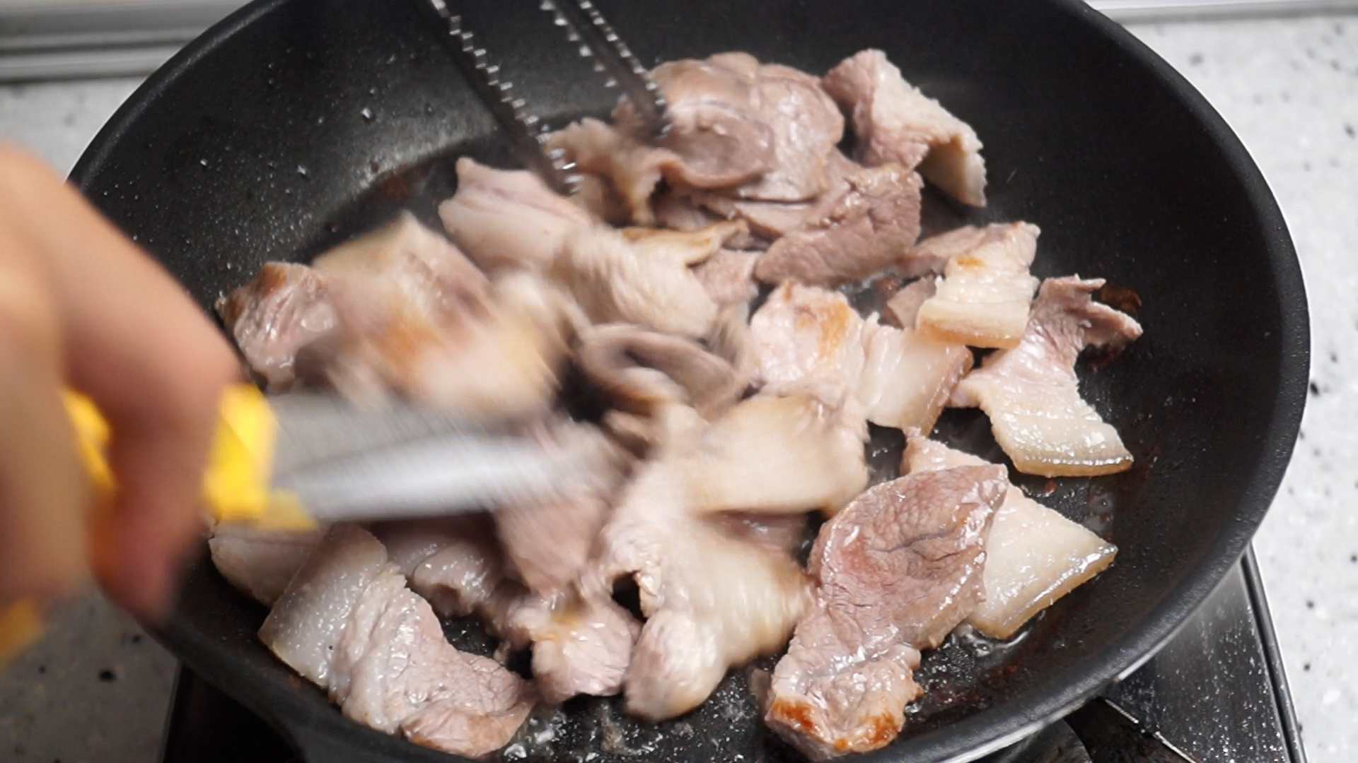 10. 팬을 강불로 달궈 앞다리살을 두께가 너무 두껍지 않은 구이용으로 선택해서 90% 이상 구운 다음에 먹기좋게 잘라주세요. 이때 적당히 기름이 나와서 자글자글 거리고 있어야 합니다. 기름이 너무 적은 부위라 기름이 많이 없으면 식용유를 1스푼 추가해주세요.
