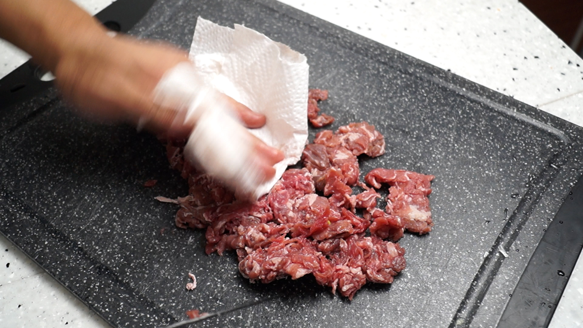4. 키친 타월로 꾹꾹 눌러 핏기를 적당히 제거하시면 좀더 깔끔한 약고추장을 즐길수 있습니다.