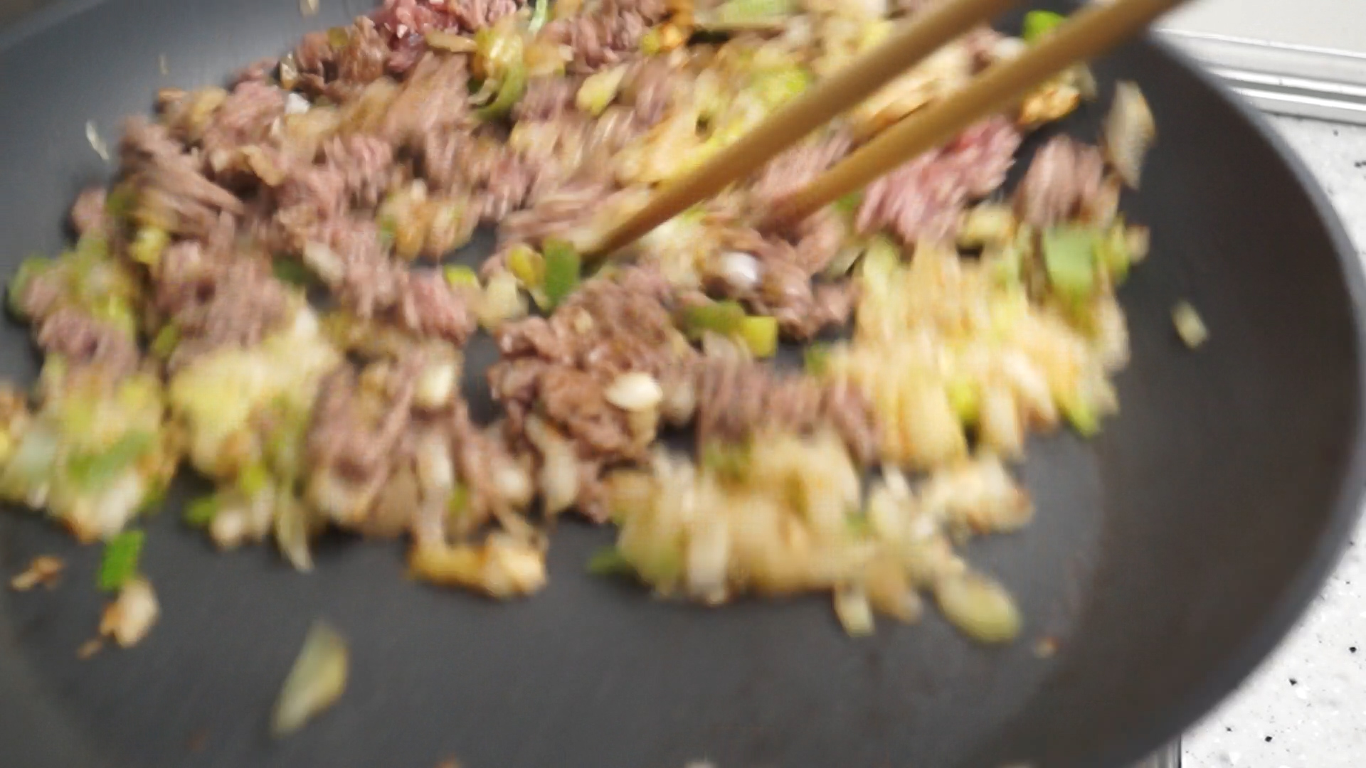 10. 소고기를 넣고 뭉친고기를 풀어가면서 볶아주세요. 양파 마늘 대파를 순서대로 넣은 이유는 기름에 빨리 익는 순으로 넣었습니다. 이 과정이 귀찮으시면 중불에 달궈진 기름에 양파 마늘 대파 를 한번에 넣고 2~3분 볶은 다음 고기를 넣어주세요.