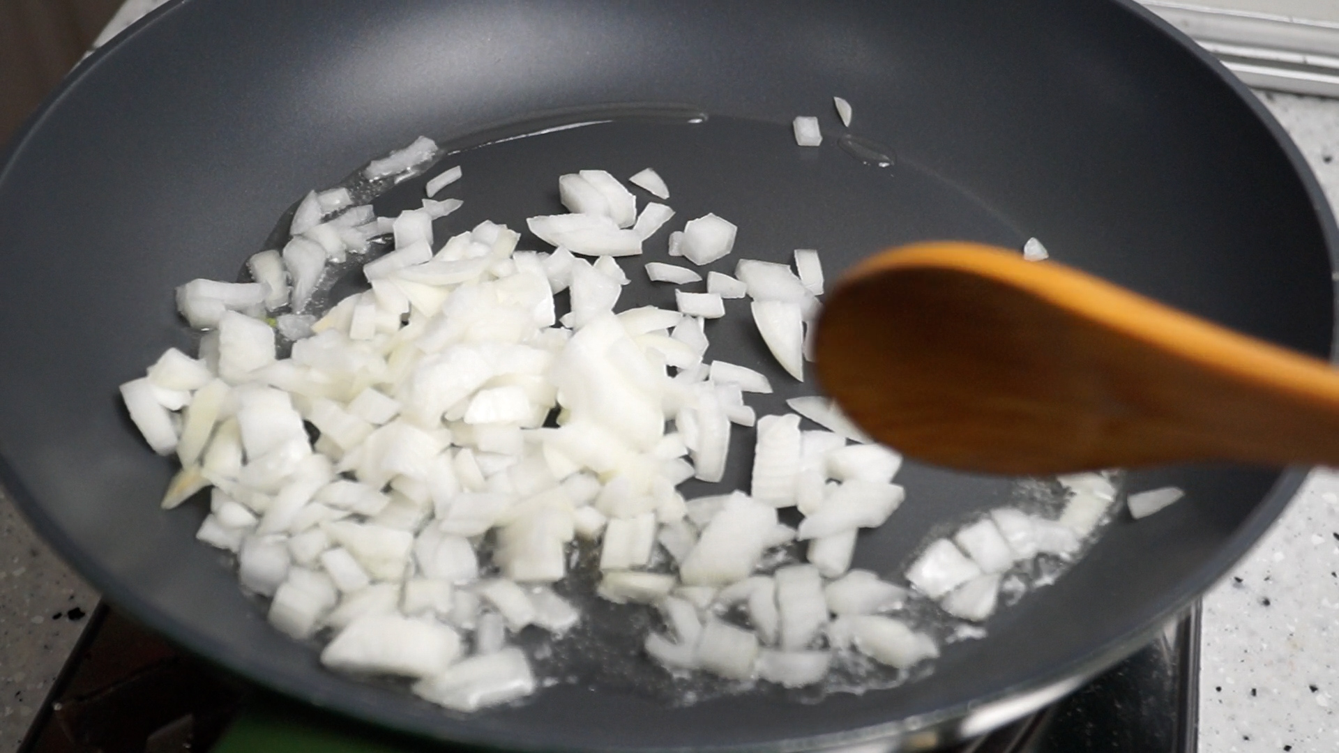 7. 팬에 기름을 붓고 달궈진 기름에 양파를 넣고 1분 정도를 볶아주세요.
