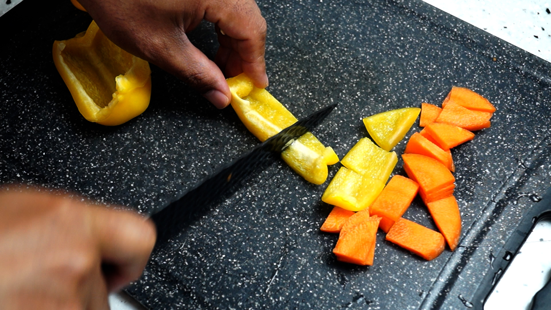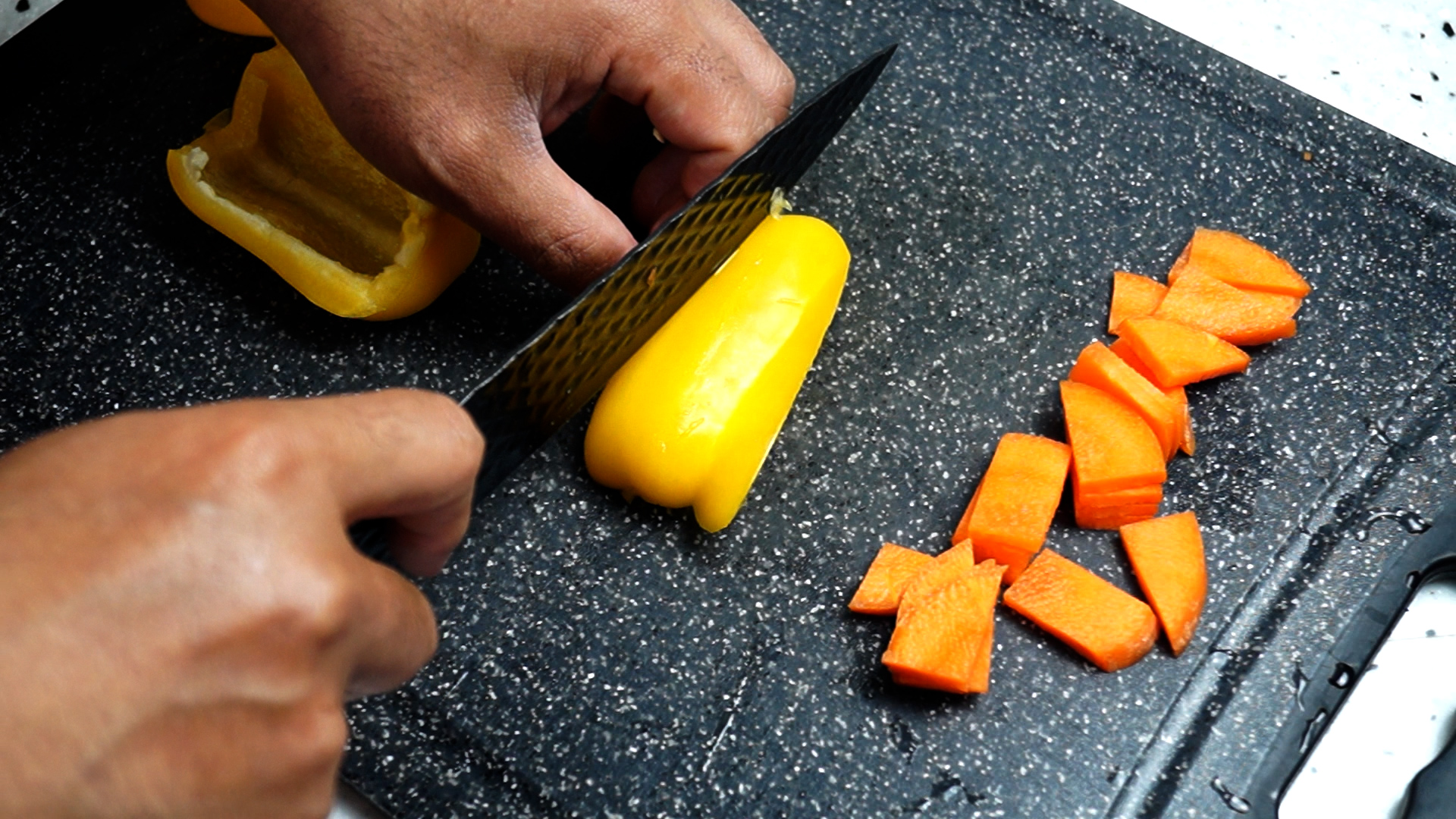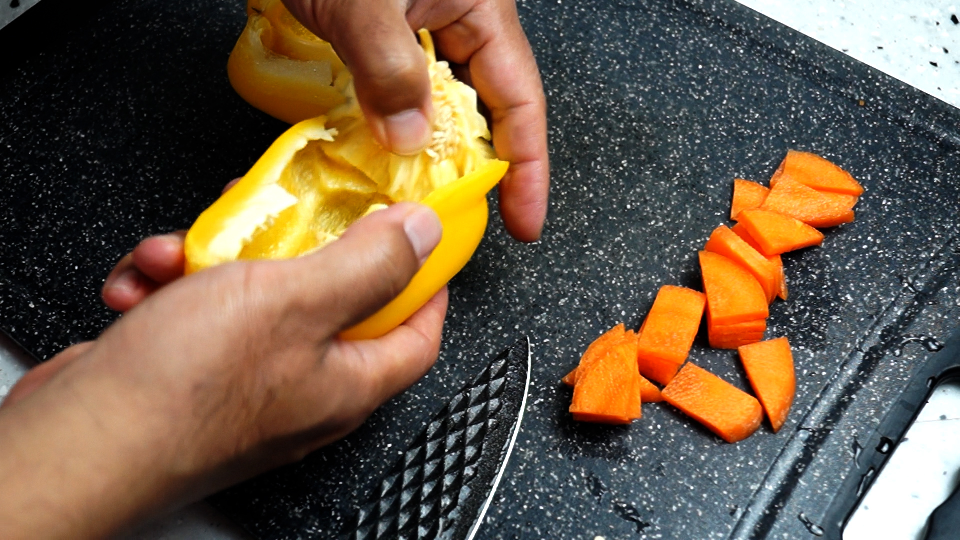 3. 파프리카는 미끄럽고 단단한 바깥부분으로 썰면 손이 미끄러져 다칠수 있으니 주의하세요.