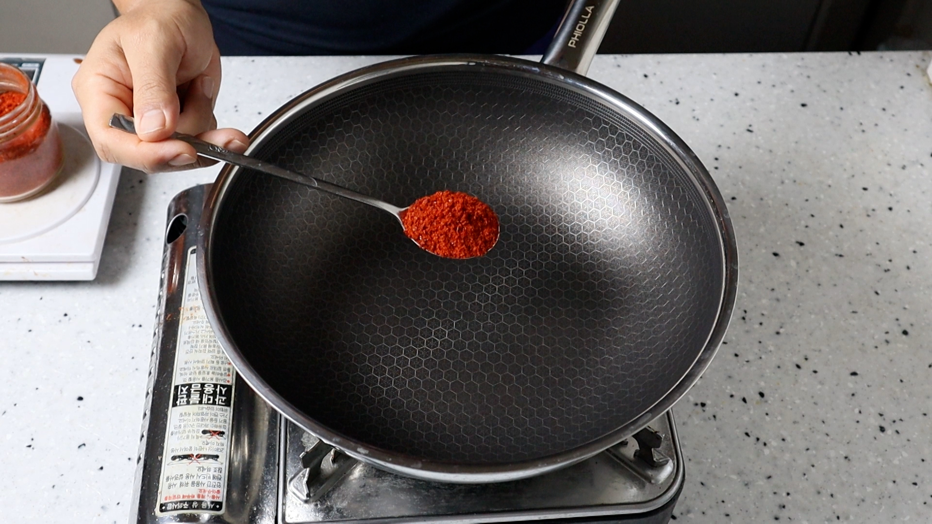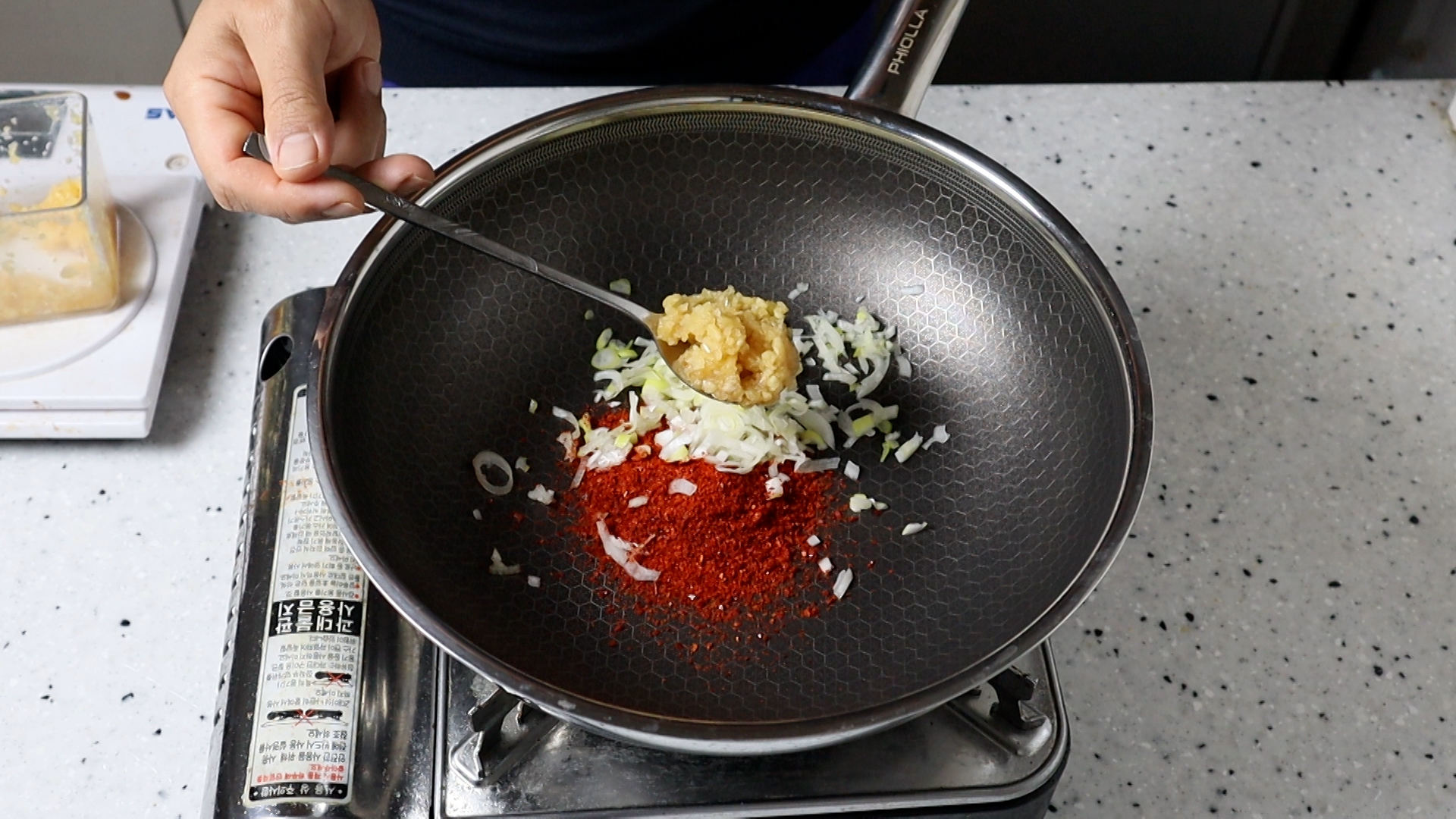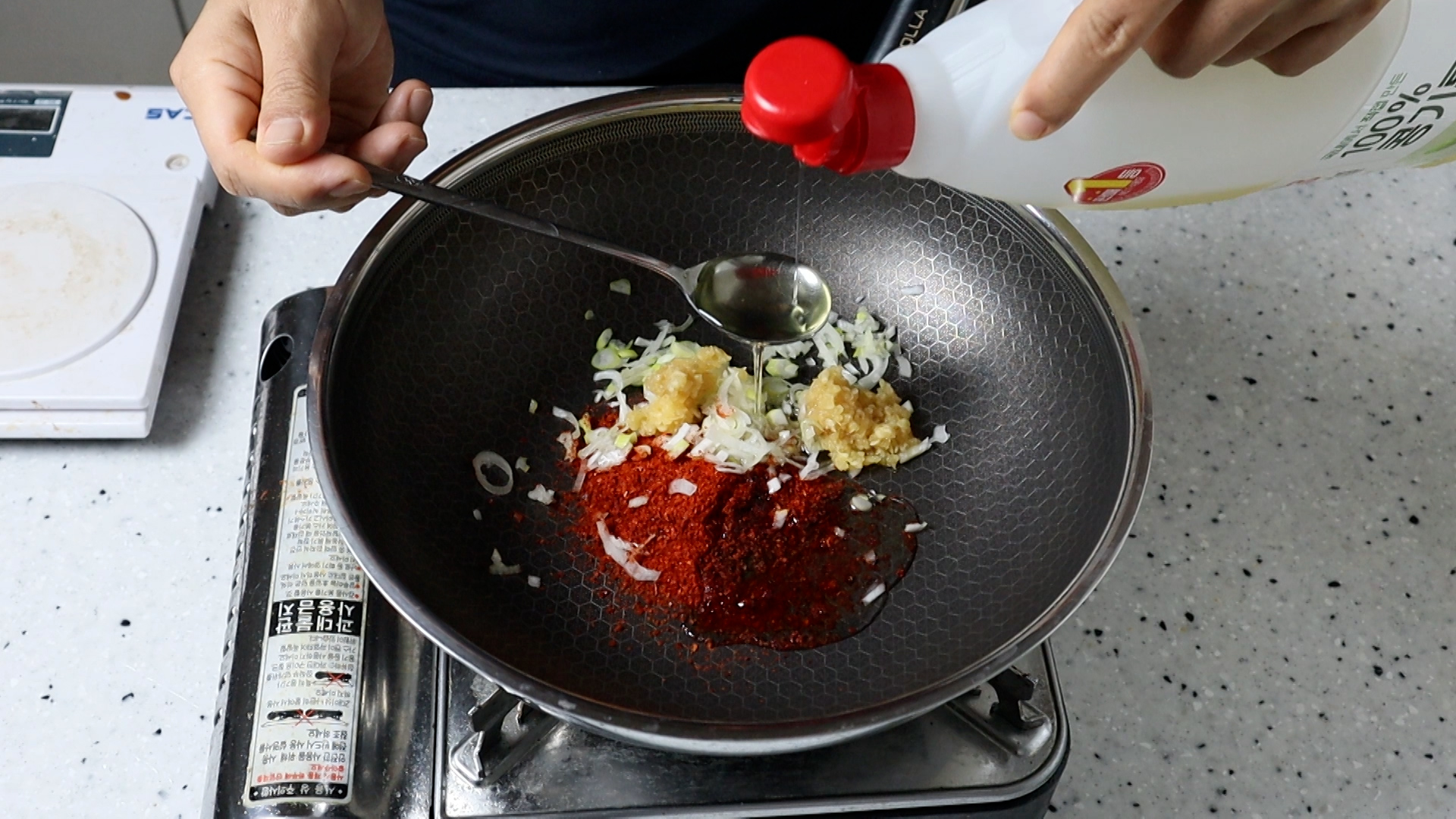 8. 웍에 파,마늘,고추기름에 적힌 재료를 전부 넣어주세요. 고춧가루는 중간입자 고춧가루 입니다.