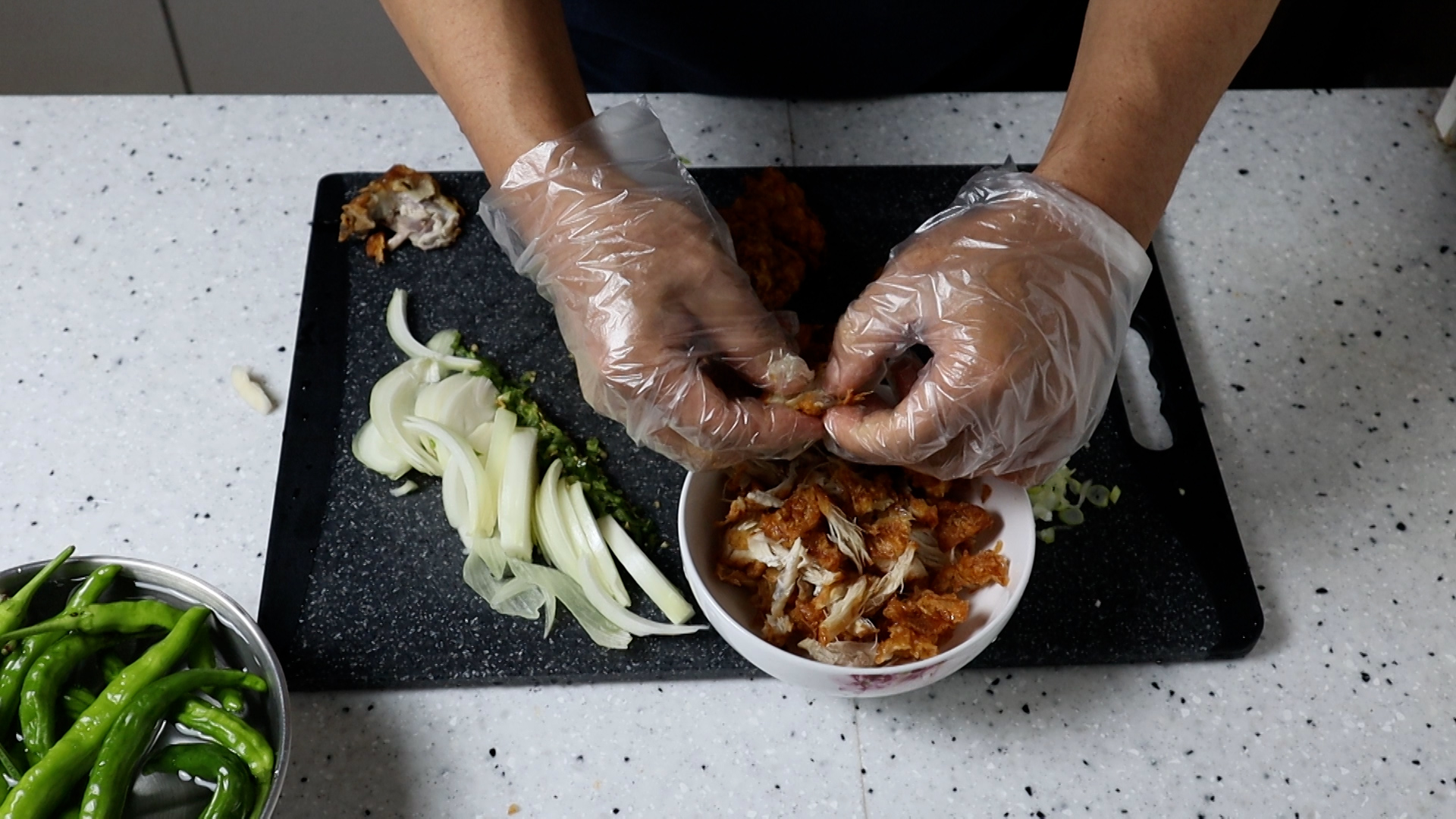 6. 후라이드 치킨을 잘게잘게 찢어주세요. 냉장고에 들어 있던건 잘 안 찢어지니 전자렌지에 30~40초 돌린 다음 찢어주세요.