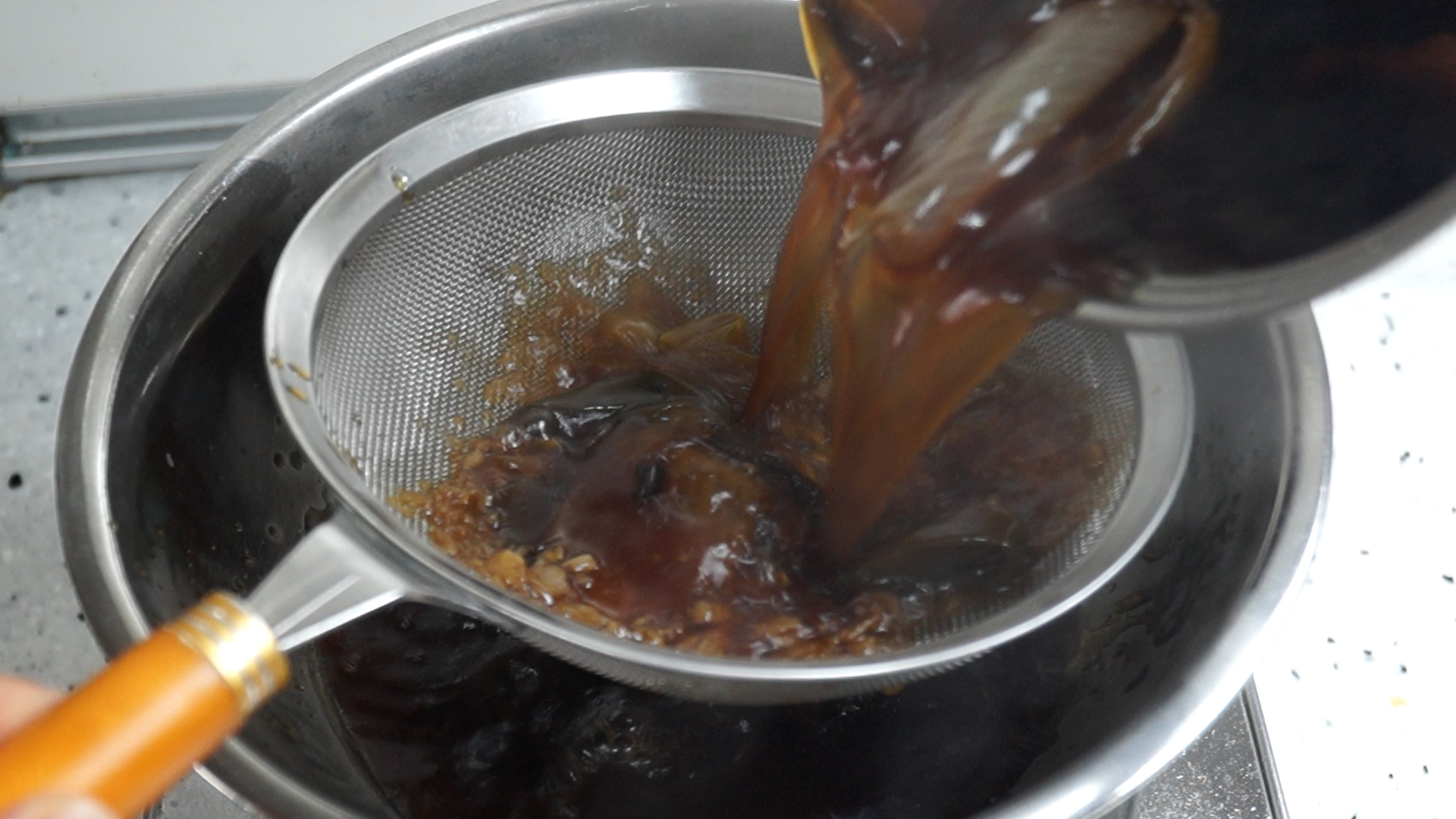 13. 채반에 국물을 전부 부어주시고 숟가락으로 양파와 대파를 꾹꾹 눌러서 즙을 짜내주세요. 양파,대파를 짜주셔야 양념이 더욱 맛있습니다.
