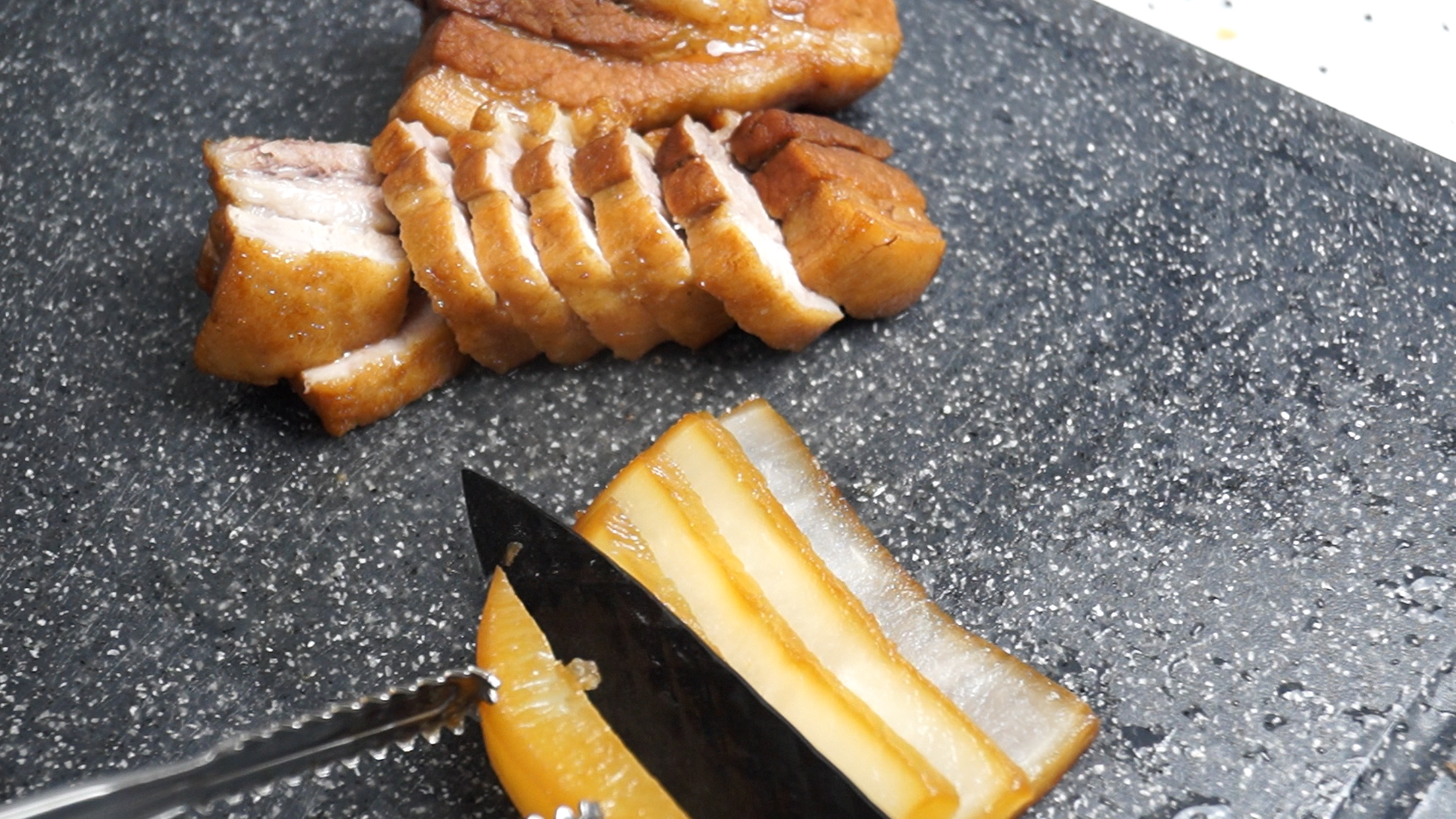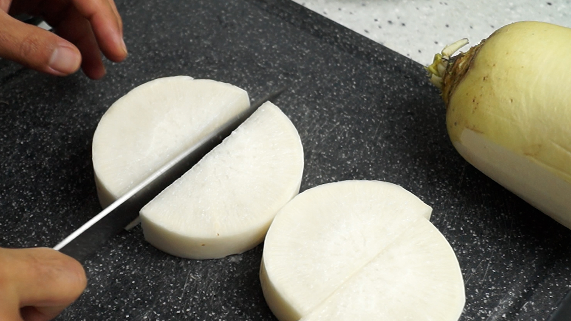 14. 고기와 무우를 먹기좋게 잘라주세요. 저는 고기는 1cm 두께로 무우는 3~4mm로 좀더 얇게 썰었어요
