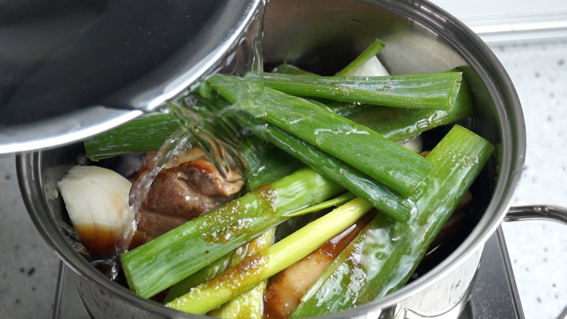 10. 물을 부어주고 후추,통마늘,생강도 넣어주세요. 물 대신에 다시마 우린물을 쓰시면 더 맛있는 차슈덮밥을 만드실수 있습니다.