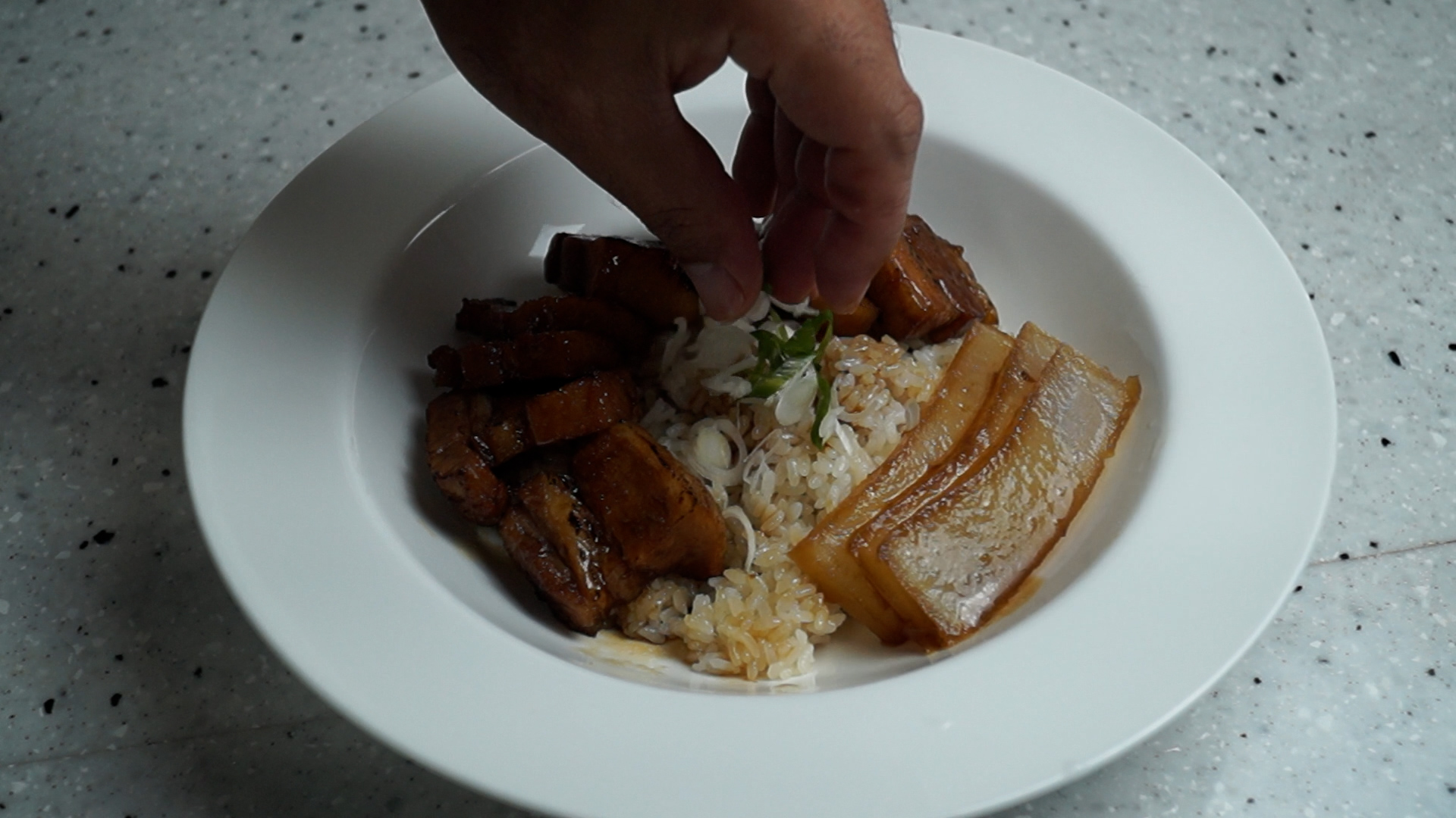 17. 밥위에 고기와 무우를 적당히 올려주시고 졸인 소스 3~4스푼을 골고루 뿌린다음 대파를 흰대 초록대 섞어 얇게 썰어서 올려주시면 중간중간 올라오는 대파풍미가 아주 좋답니다.