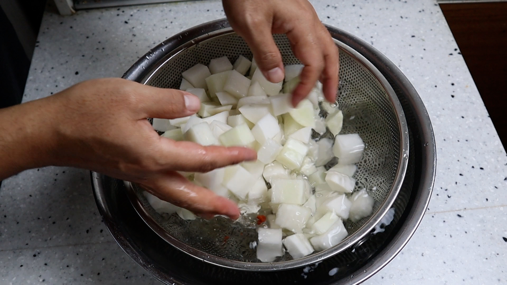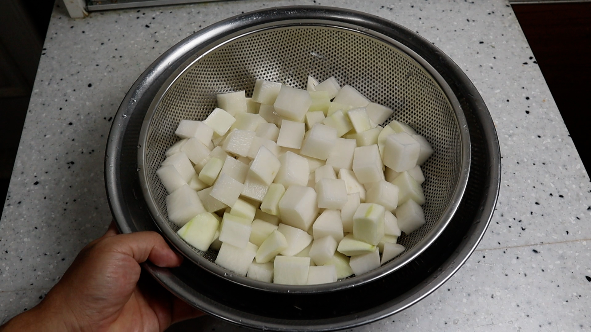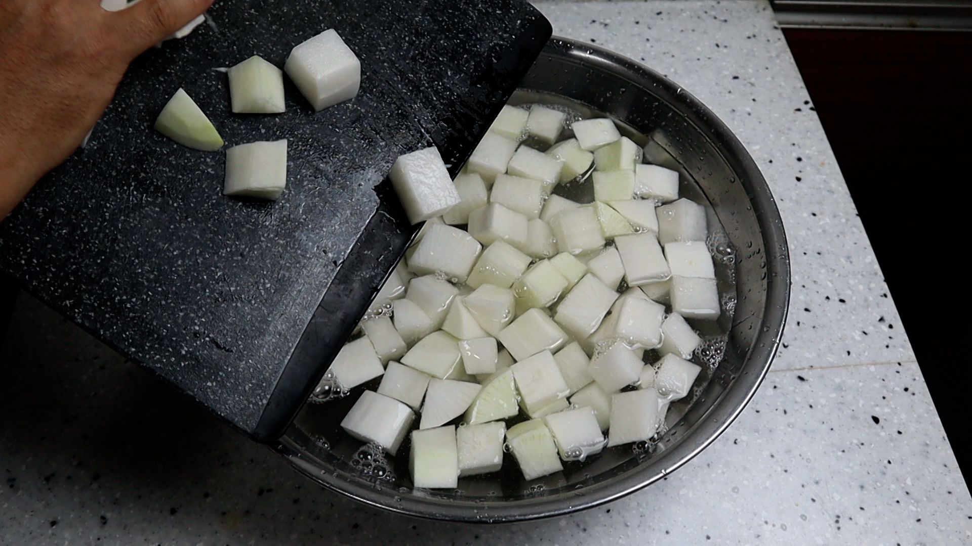 3. 무우는 깍둑을 썰어주는데 사람마다 선호하는 깍두기 크기가 다 다르더라고요. 기호에 맞게 썰어주시고 저는 참고로 새끼손가락 1~1.5마디 크기 2~3cm 사이로 써는걸 선호 한답니다.