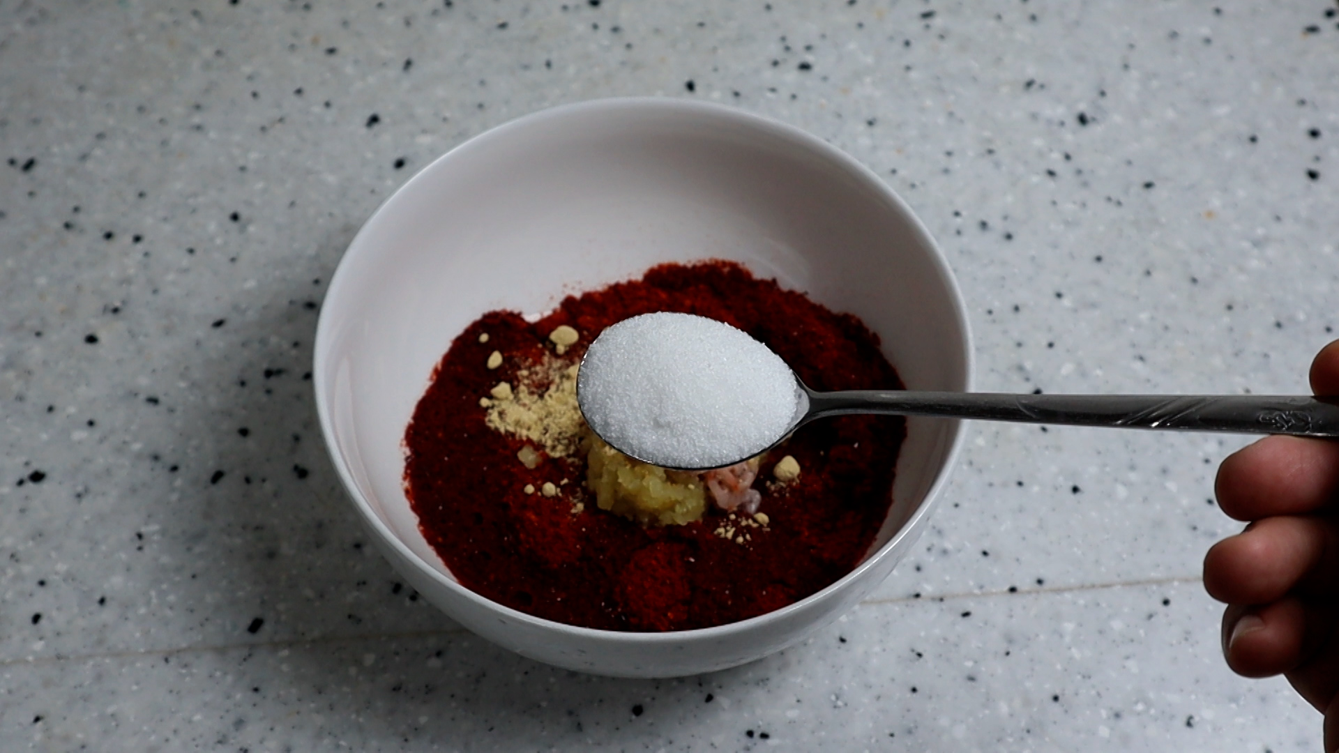 13. 양념란에 적힌 재료를 전부 볼에 넣어주세요. 고춧가루는 김장용으로 나온것중에 중간입자 고춧가루를 사용해주세요.