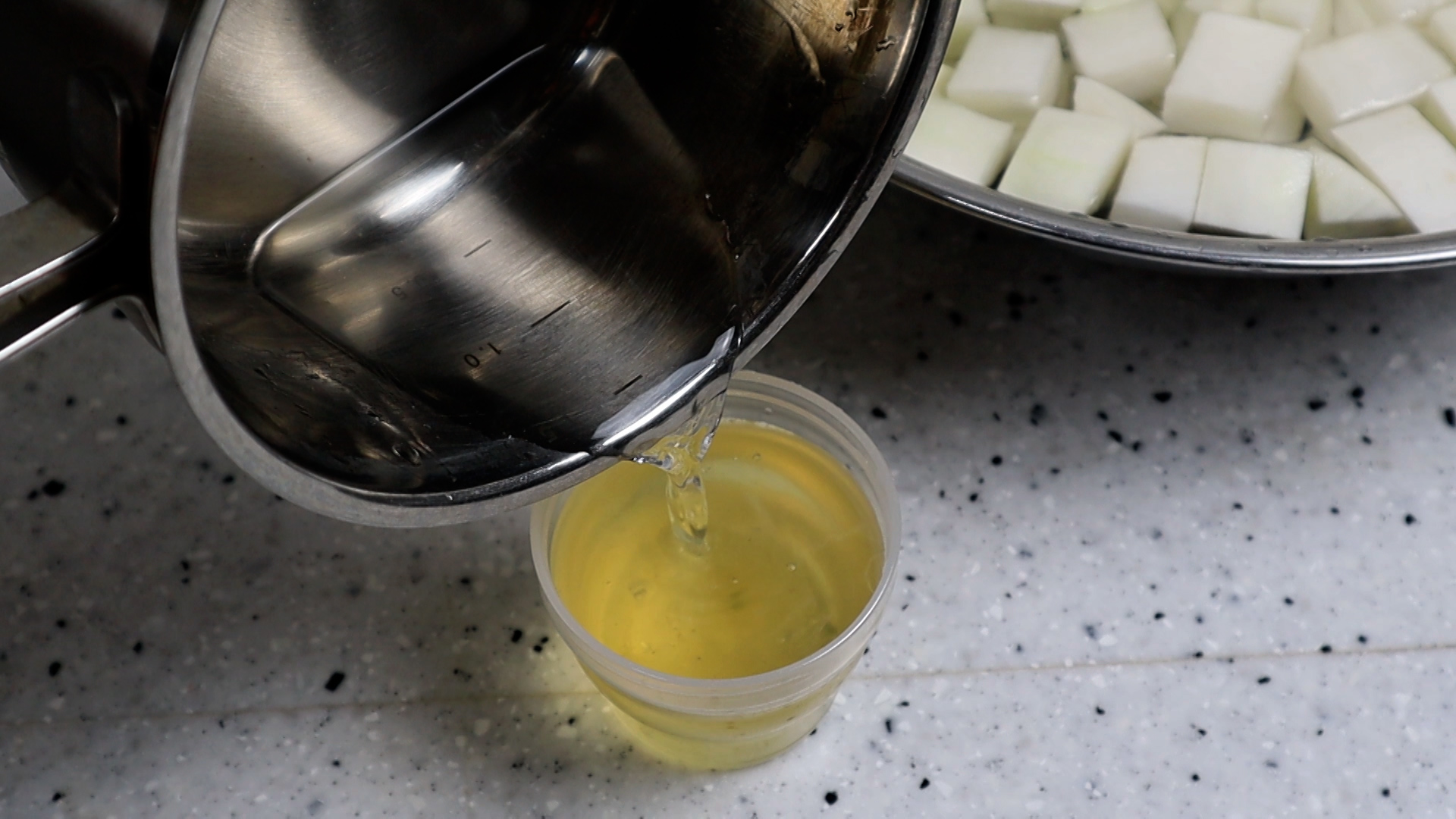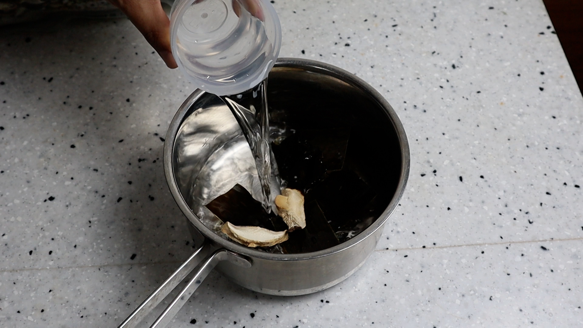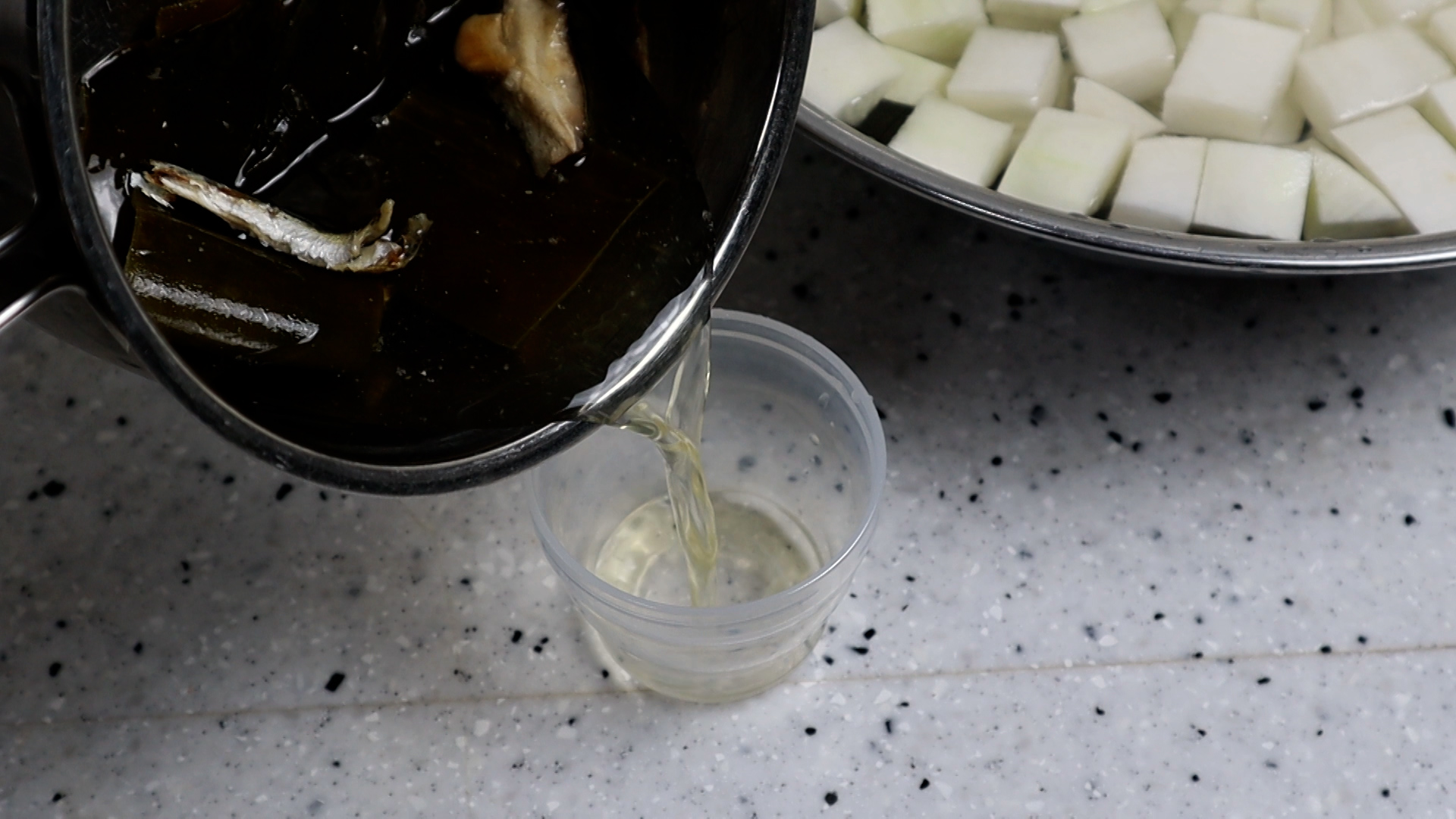 21. 불린육수를 200cc 컵에 완전히 따라주세요. 이때 진득한 액체가 있는데 다시마에서 나온 감칠맛 덩어리니까 절대 걸러내지 말고 부어주세요.