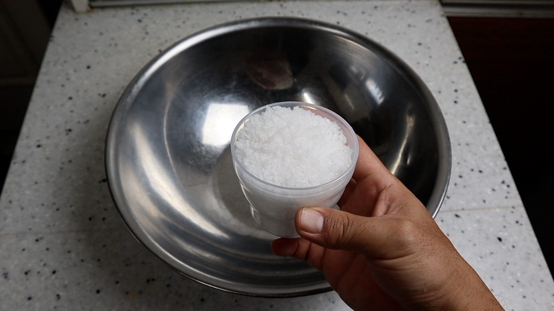 4. 볼에 소금을 부어주세요. 굵은 소금은 아무래도 이물질이 좀 있는 편이라서 김장할때 아니면 저는 세척이 된 꽃소금을 주로 사용합니다.