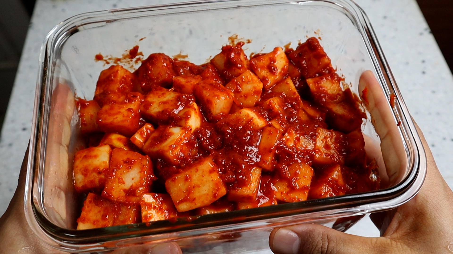 32. 깍두기는 바로 먹는것 보다는 밀폐용기에 담아서 상온에 여름엔 6시간 겨울엔 12시간 정도 뒀다가 냉장실에서 3~4일 익혀서 드시면 더욱 맛있습니다.