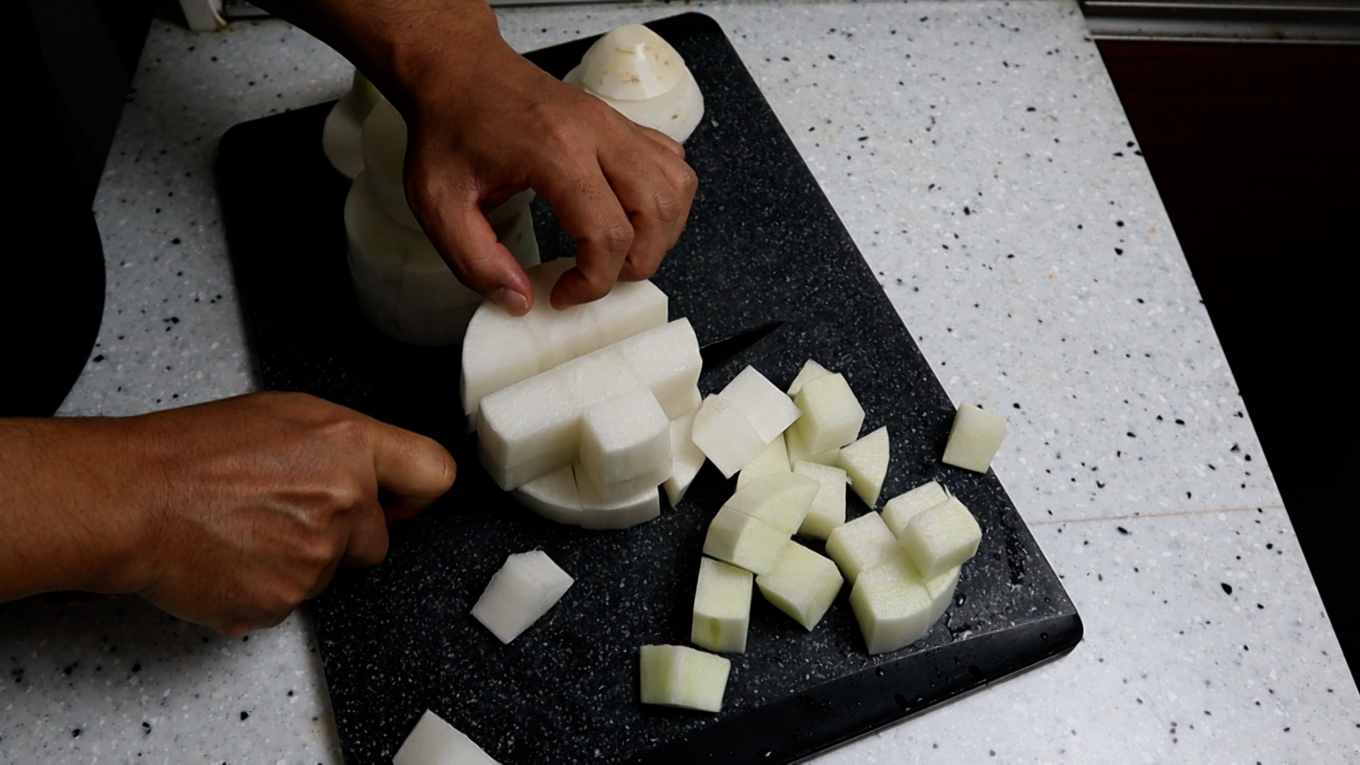 3. 무우는 깍둑을 썰어주는데 사람마다 선호하는 깍두기 크기가 다 다르더라고요. 기호에 맞게 썰어주시고 저는 참고로 새끼손가락 1~1.5마디 크기 2~3cm 사이로 써는걸 선호 한답니다.
