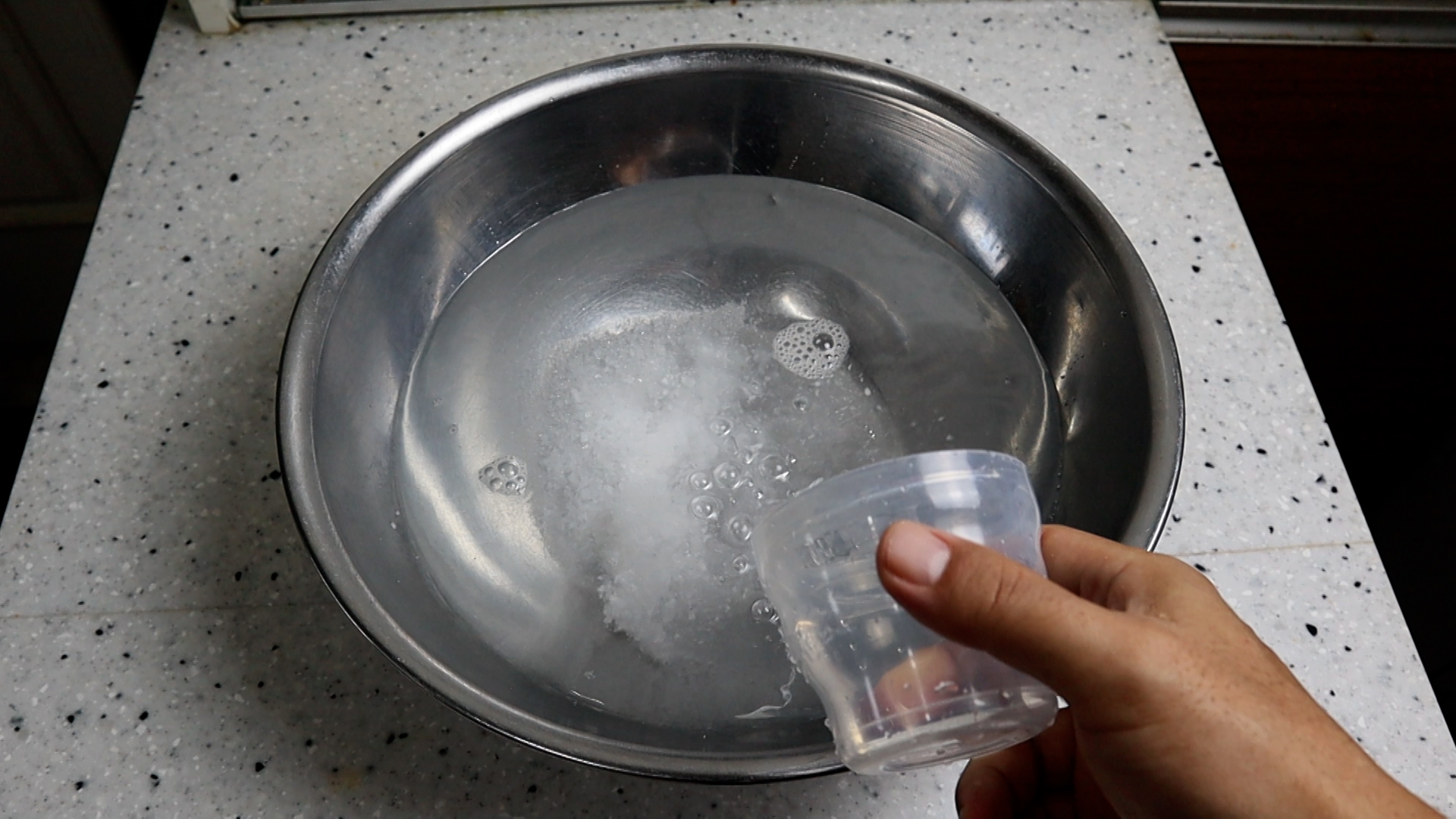 5. 물 2리터를 부어서 골고루 저어서 소금을 완전히 녹여주세요.