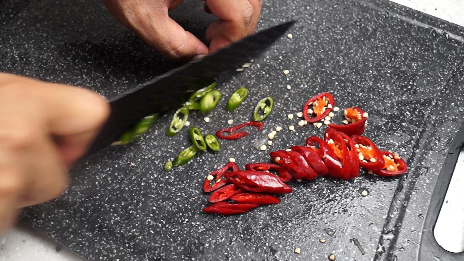 16. 홍고추 청양고추 1개씩 어슷 썰어주세요. 홍고추는 없으시면 그냥 청양고추 2개 써시면 됩니다.