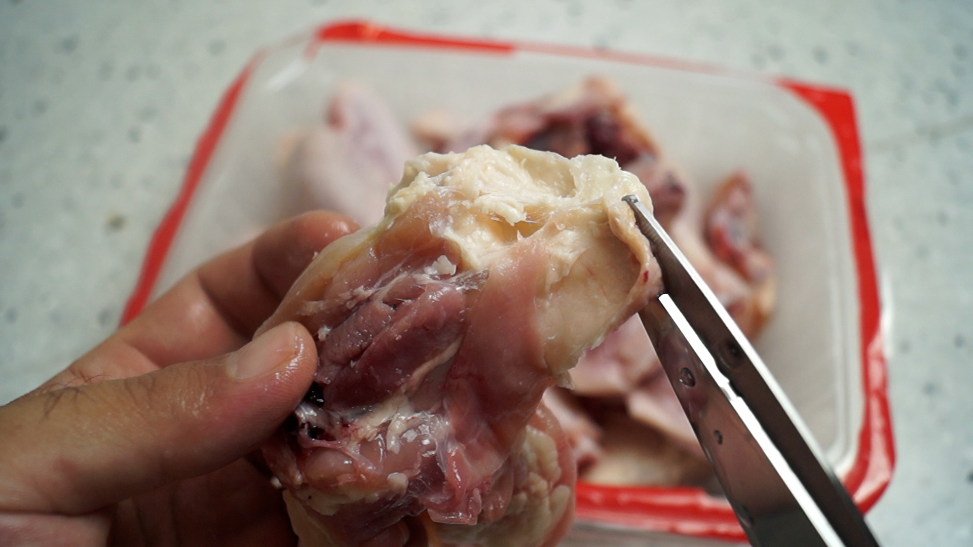 2. 좀더 깔끔하게 드시려면 이런 누런 기름과 갈비뼈 사이 내장들을 제거해주세요. 껍질과 기름은 딱 보시면 색감이 다르니 껍질을 벗겨내지는 마세요.