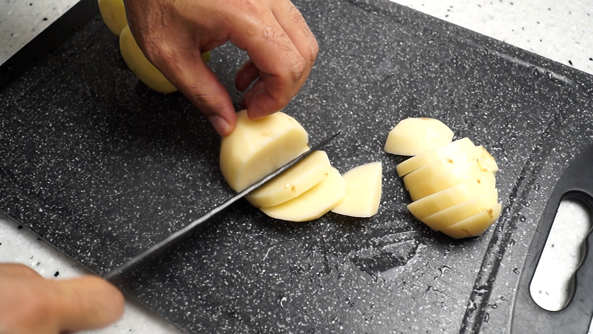 13. 감자는 너무 두껍지 않게 1cm 두께로 썰어주세요.