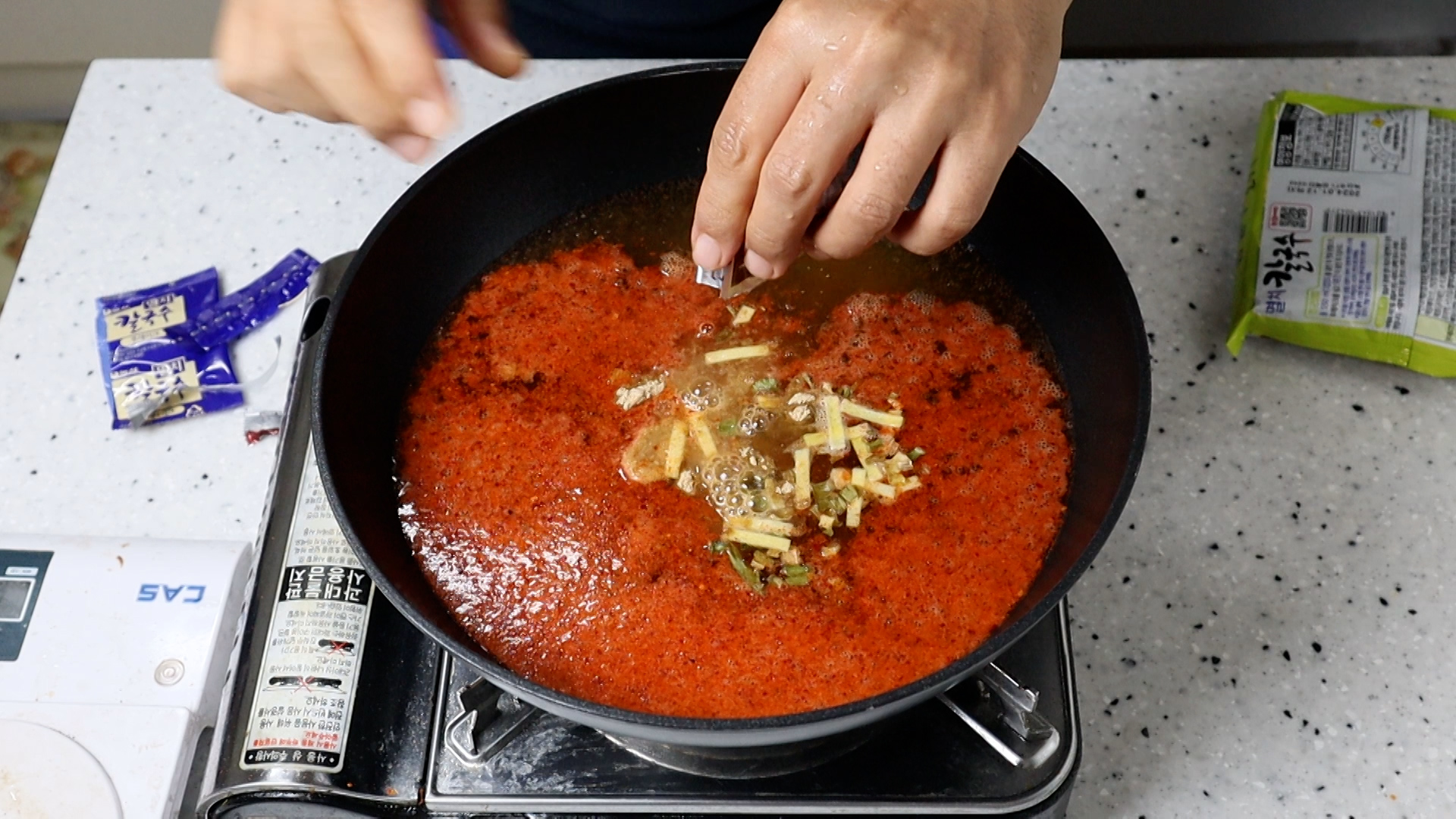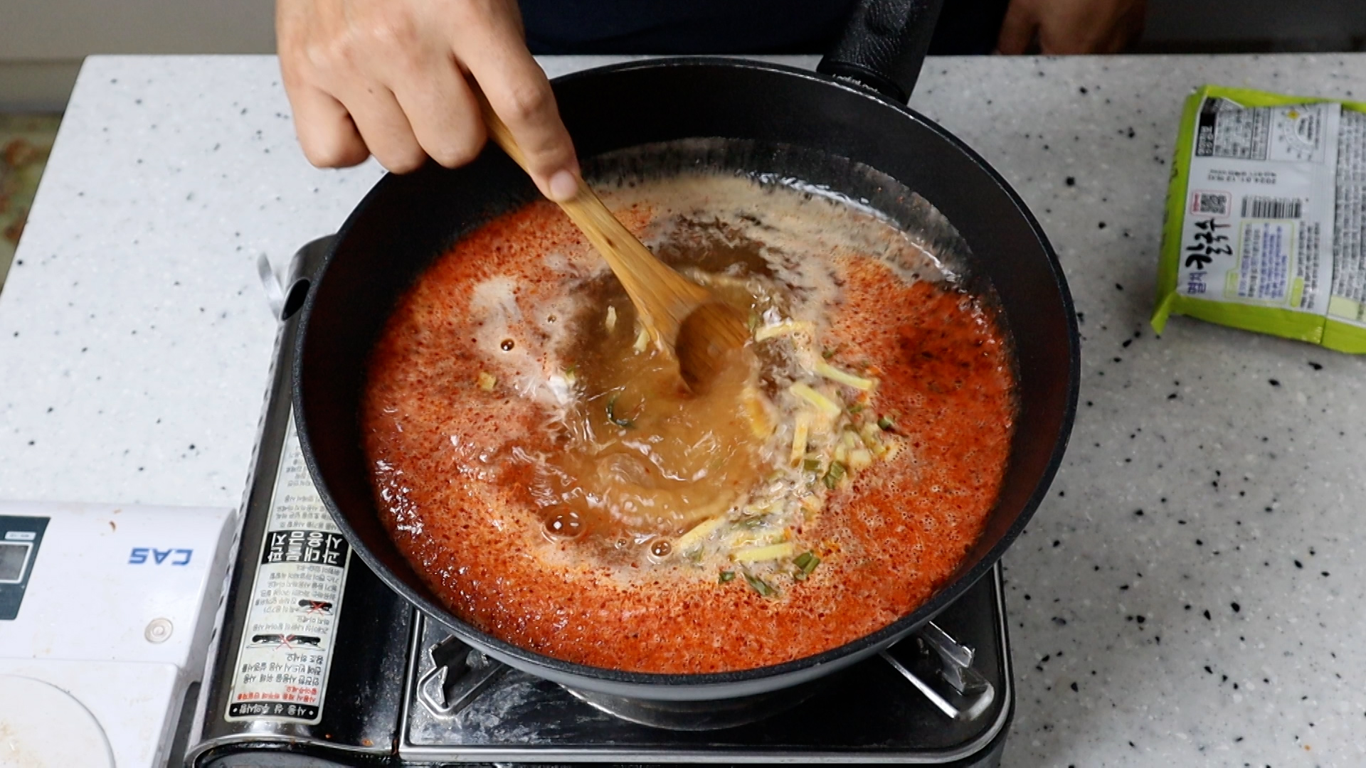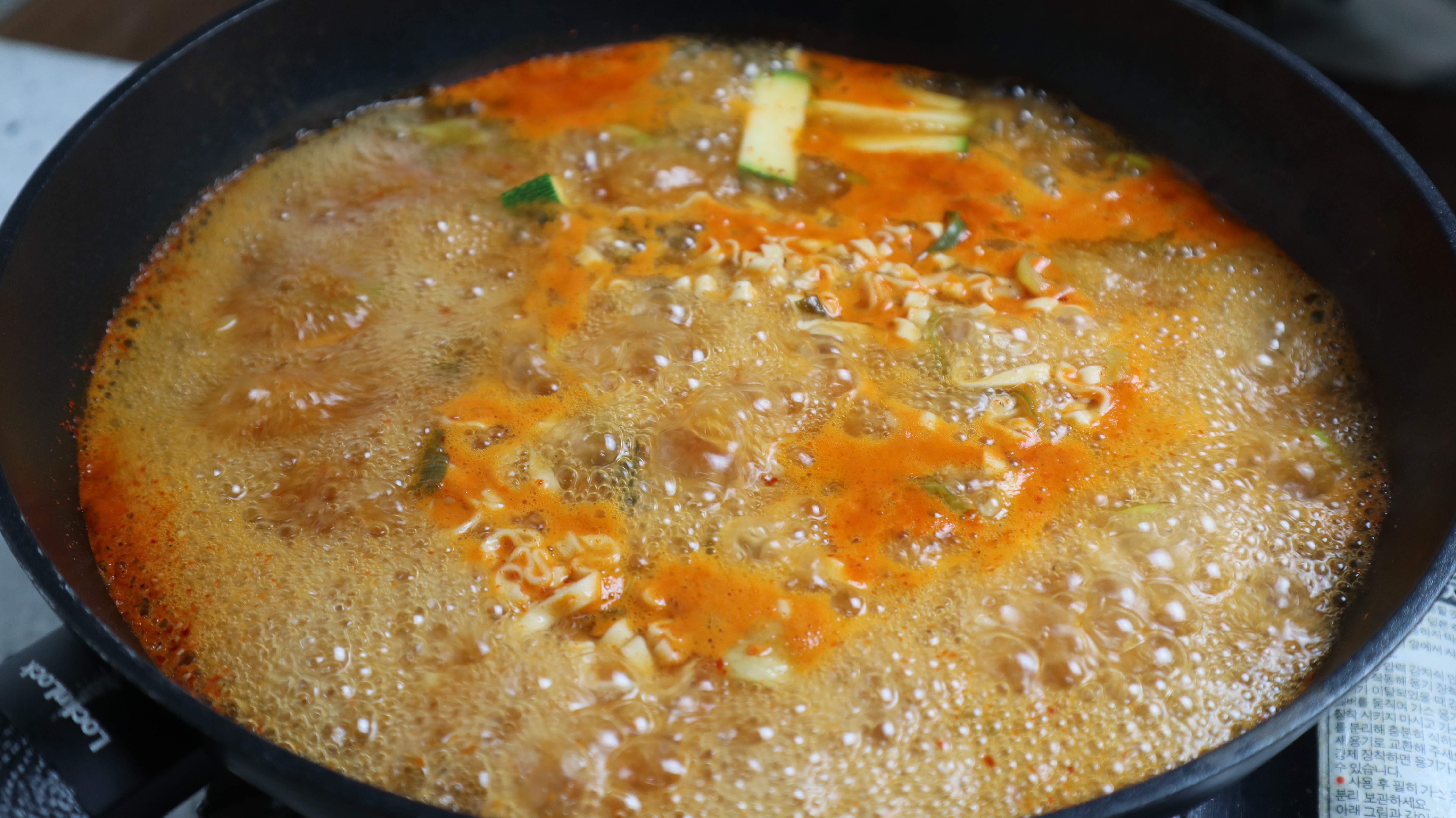 12. 분말스프와 건더기 스프를 전부 넣고 불을 강불로 올려주세요.