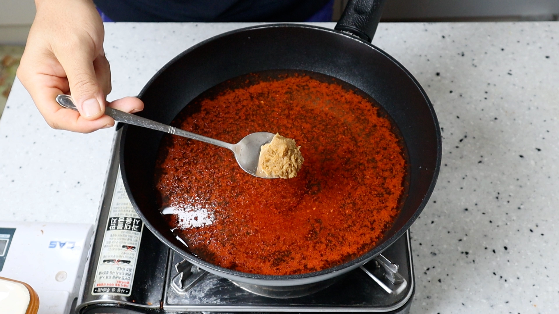 7. 장칼국수의 핵심 고추장을 1스푼 넣어주세요.