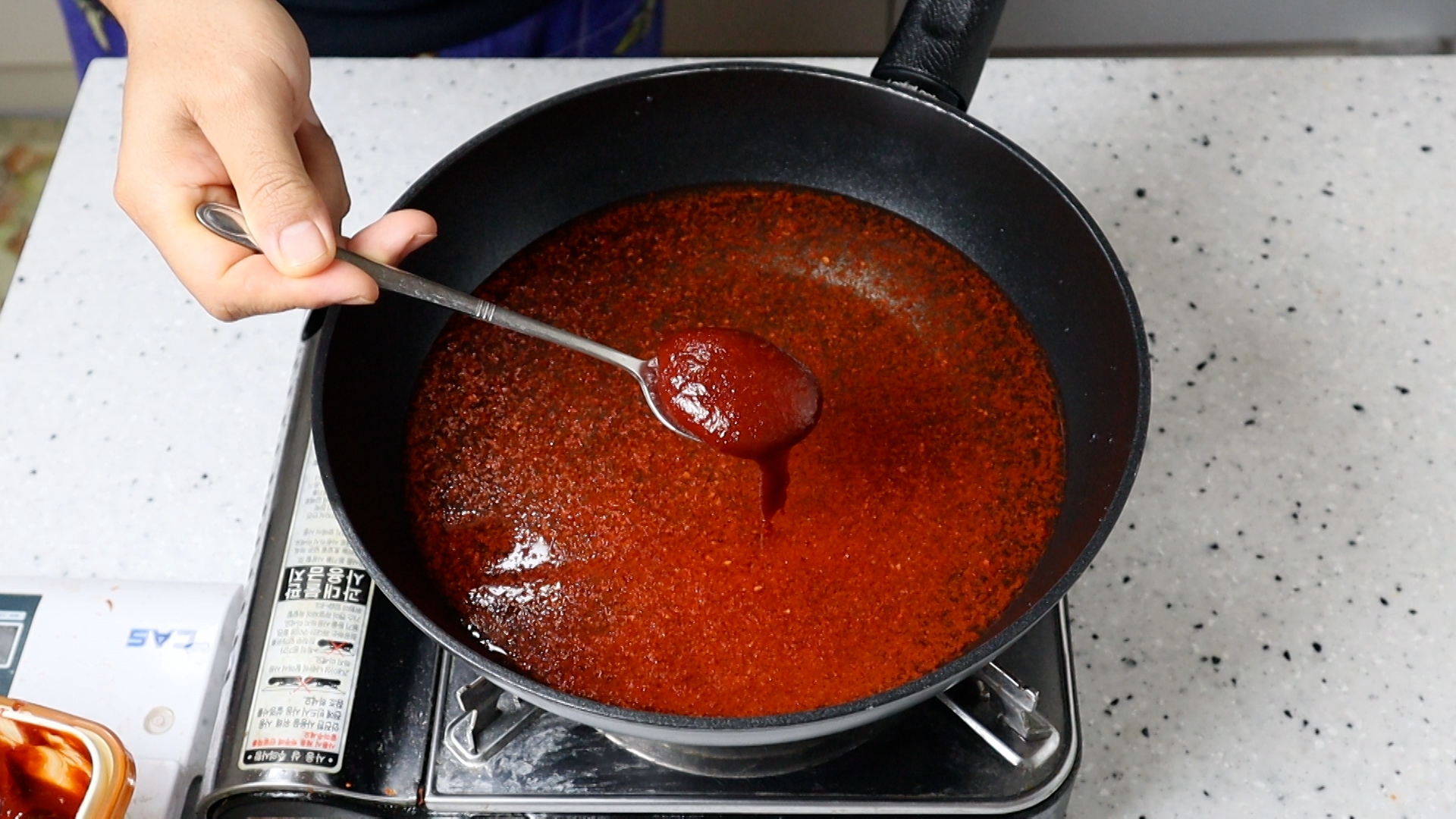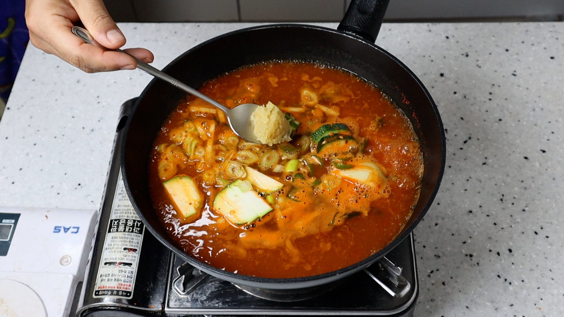 13. 물이 완전히 끓어 오르기전에 된장,고추장을 저어서 풀어주세요.
