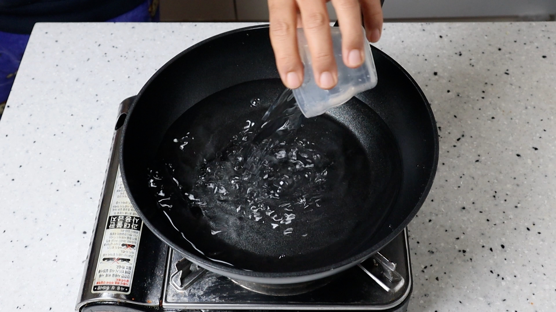 5. 웍이나 냄비에 물 5컵 1리터를 부어주세요.