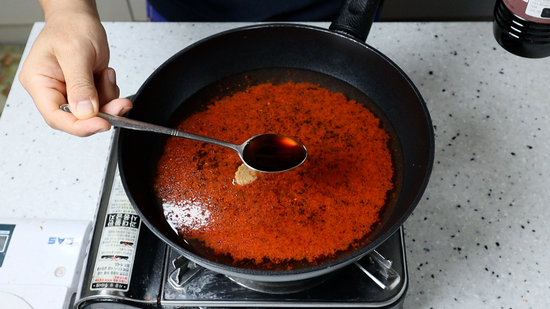 6. 양념란에 적힌 재료를 전부 넣어주세요. 고춧가루는 더~ 매콤하게 드시려면 땡초가루와 일반 고춧가루를 반반 섞어보세요.