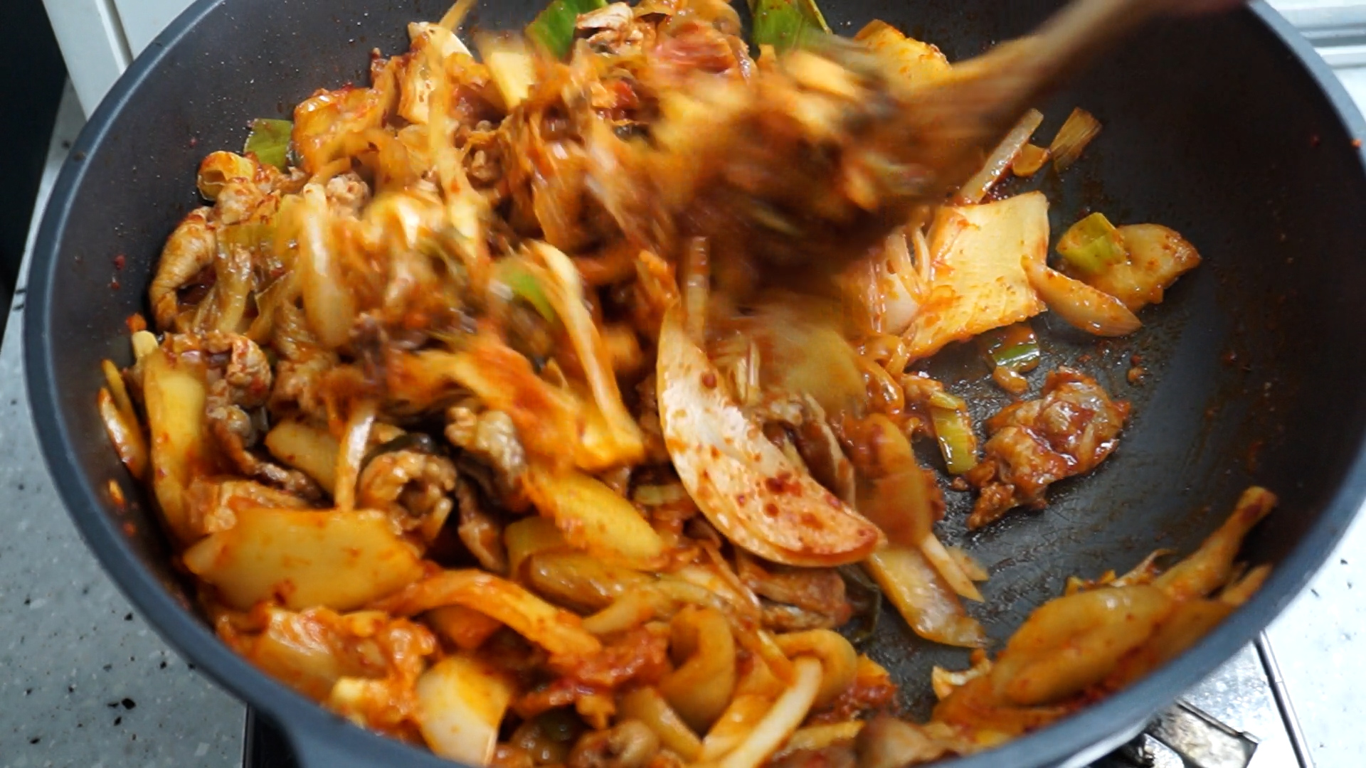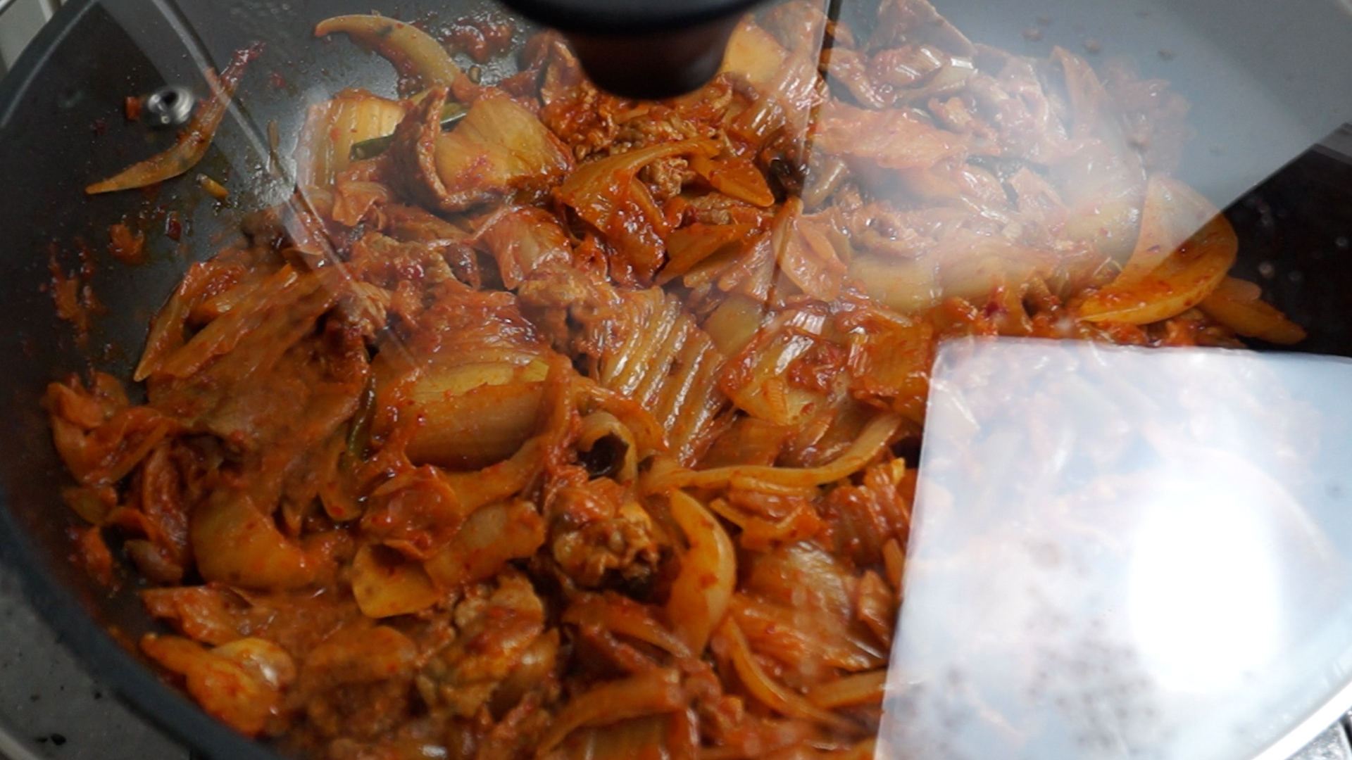 18. 약불에 5분간 방치하는걸 3~4차례 반복해서 약불에 15~20분을 김치맛이 진해지도록 만들어줍니다. 혹 불이 강해 타는것 같으면 2차례 정도만 해주셔도 되고 이 과정이 귀찮으시면 중불에 섞어가면서 4~5분을 볶아주세요.
