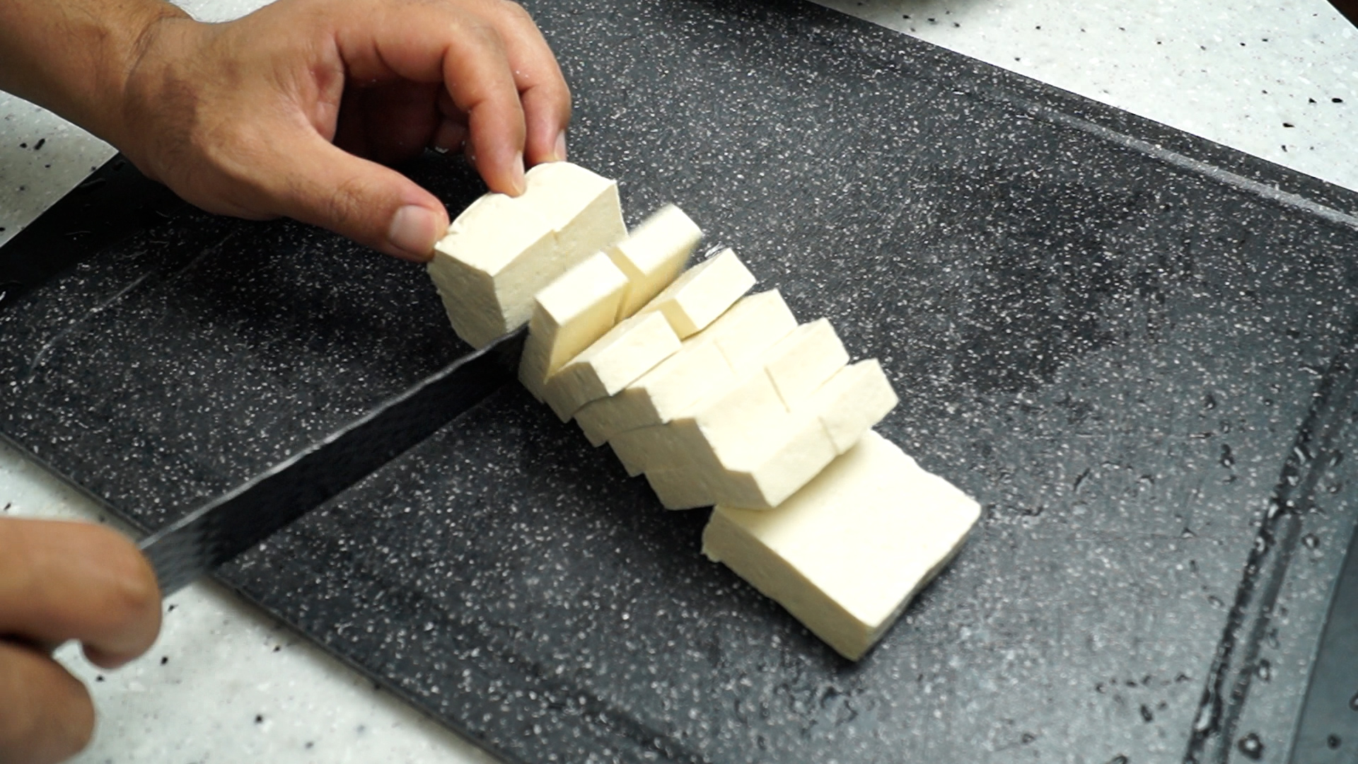 6. 두부는 단단한걸로 반모를 먹기좋게 썰어주세요. 찌개용 두부는 너무 잘 부서질뿐 아니라 수분함량이 너무 높아서 찌개를 싱겁게 할뿐 아니라 콩이 있어야 할 부분에 수분이 들어가서 영양면에서도 단단한 부침용이 더 좋습니다!