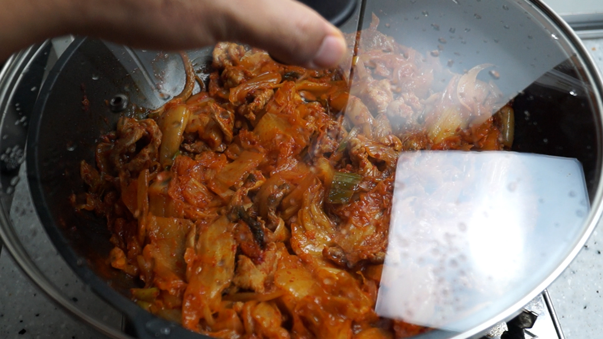 16. 불을 약불 약불로 줄이고 뚜껑을 덮은 다름 5분간 그냥 가만히 두세요. 이 과정을 거치면 김치와 양념이 한번 볶아지면서 더욱 맛있는 맛을 냅니다.