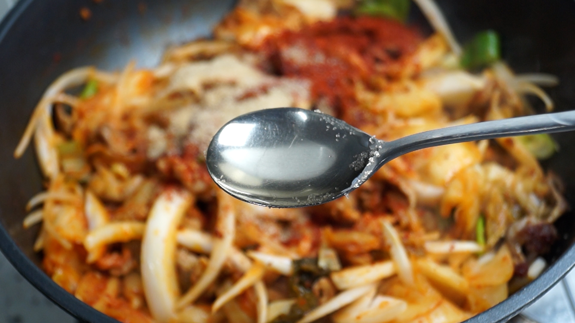 14. 김치국물을 우선 3스푼 정도를 부어주세요.