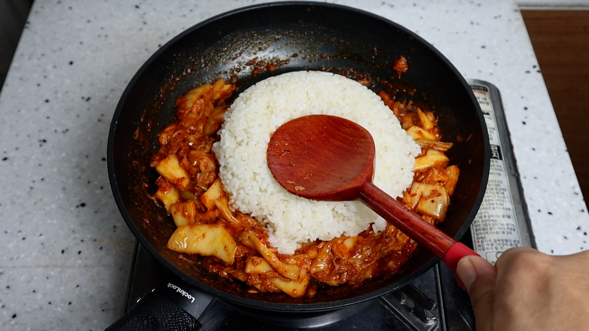 11. 중불 유지하고 밥을 넣고 볶아주세요. 밥은 뜨거운상태 보다 살짝 식은 상태로 볶아주시면 양념이 밥알에 더 잘 스며들어 더욱 맛있게 즐길수 있습니다.