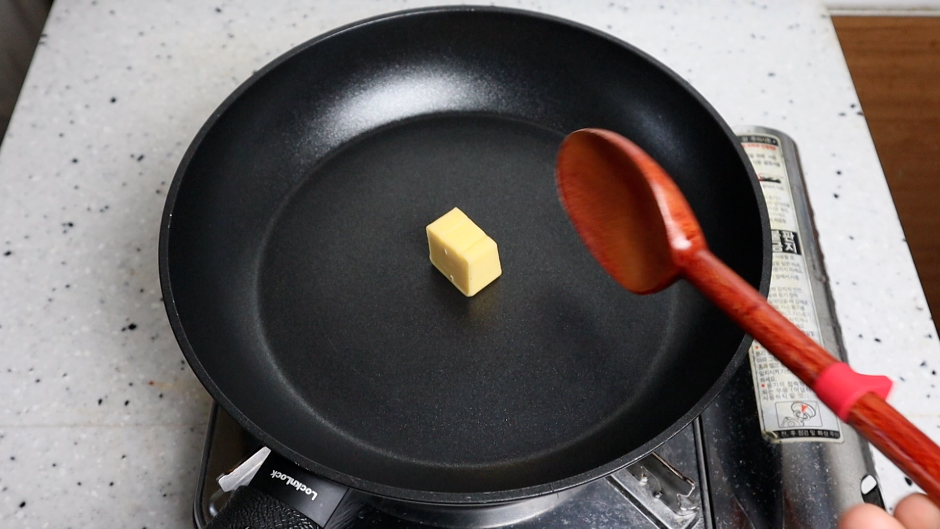 4. 코팅팬에 버터 1조각 15g 을 넣어주세요. 오리지날 레시피는 식용유 3스푼 15g인데 버터 특유의 고소한 짠맛을 보태려고 버터를 사용했어요~ 무염버터 아니고 가염 버터입니다.