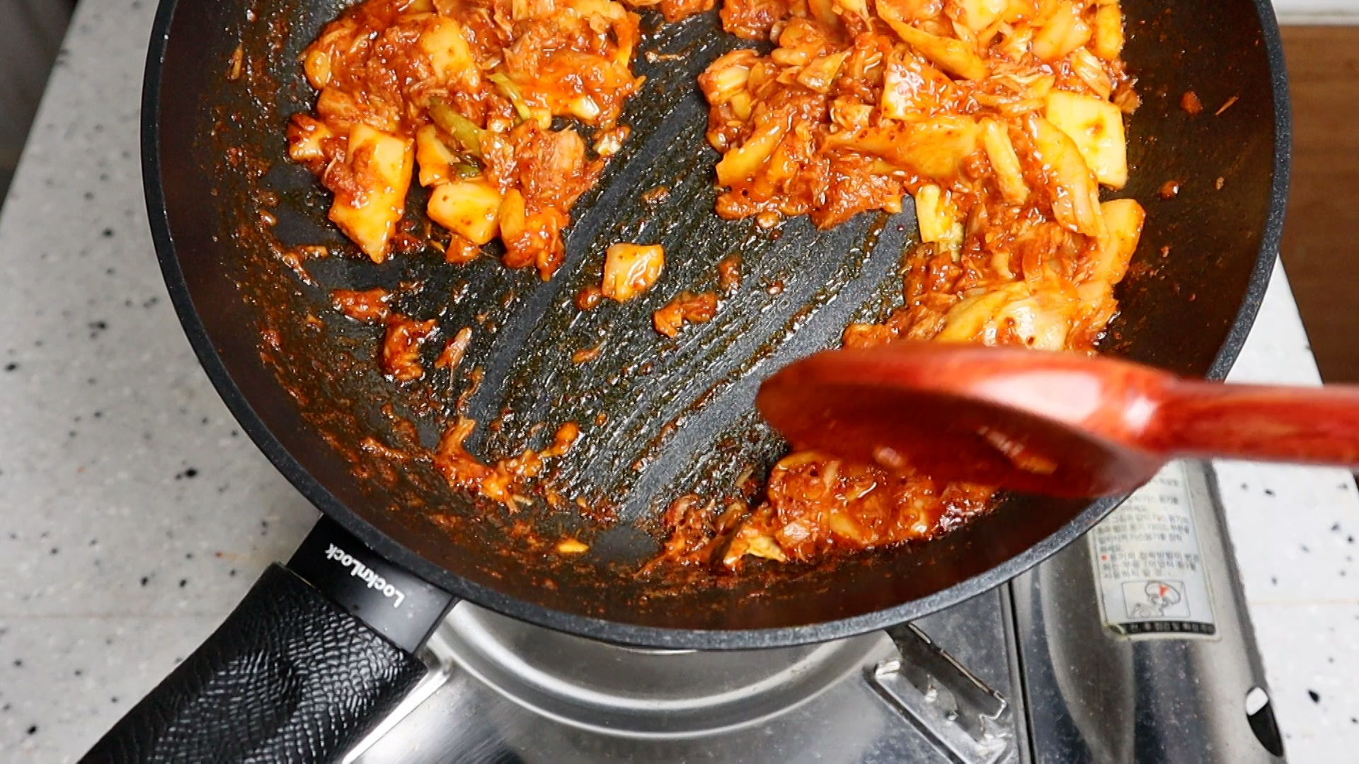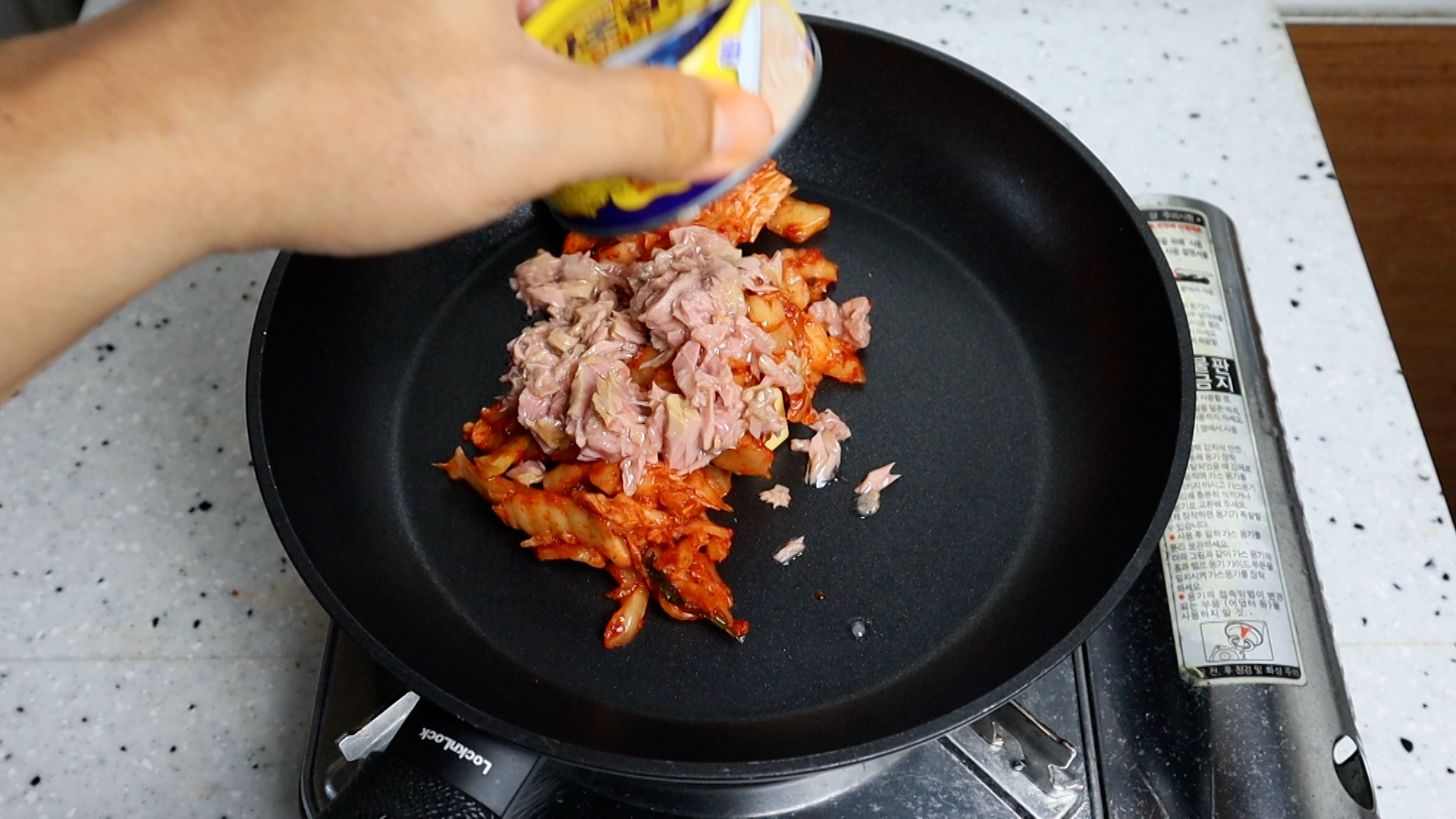 5. 김치를 부어주고 참치를 국물까지 전부 부어주세요.