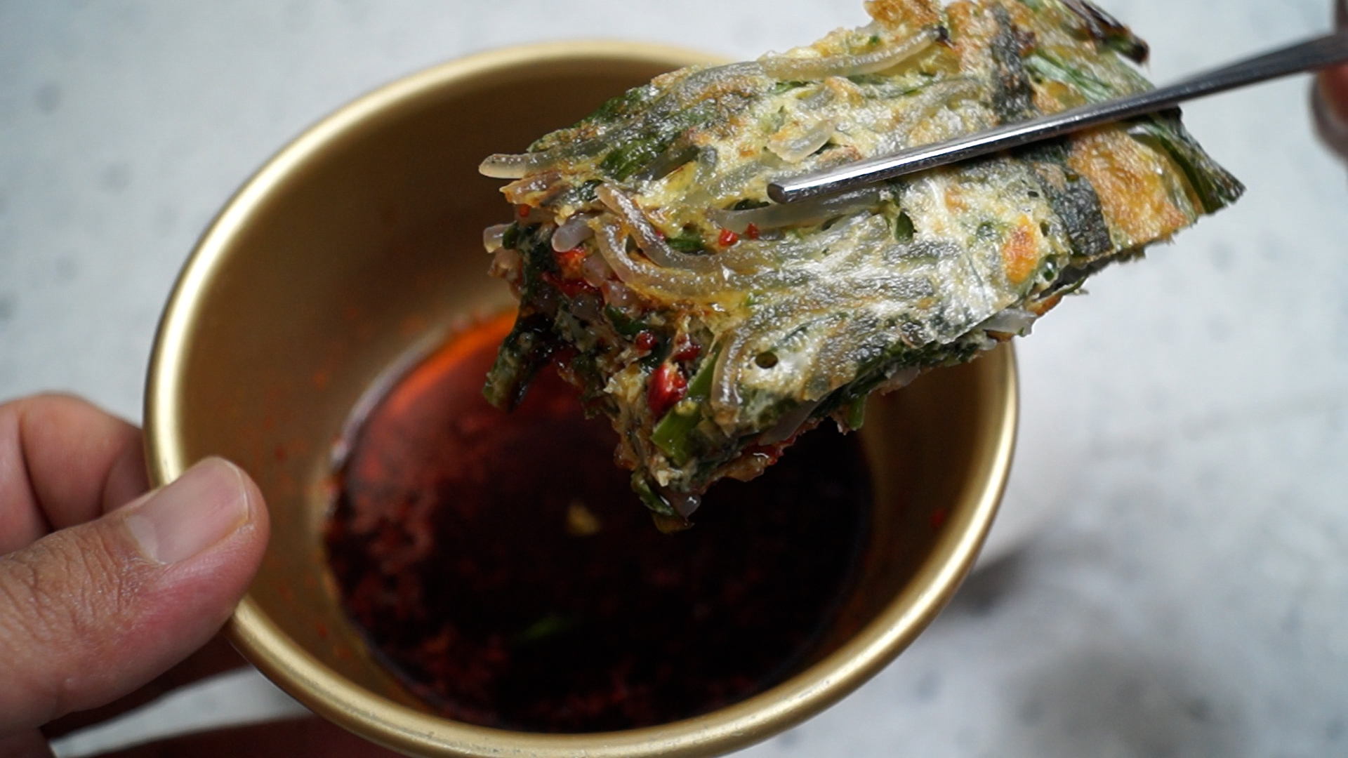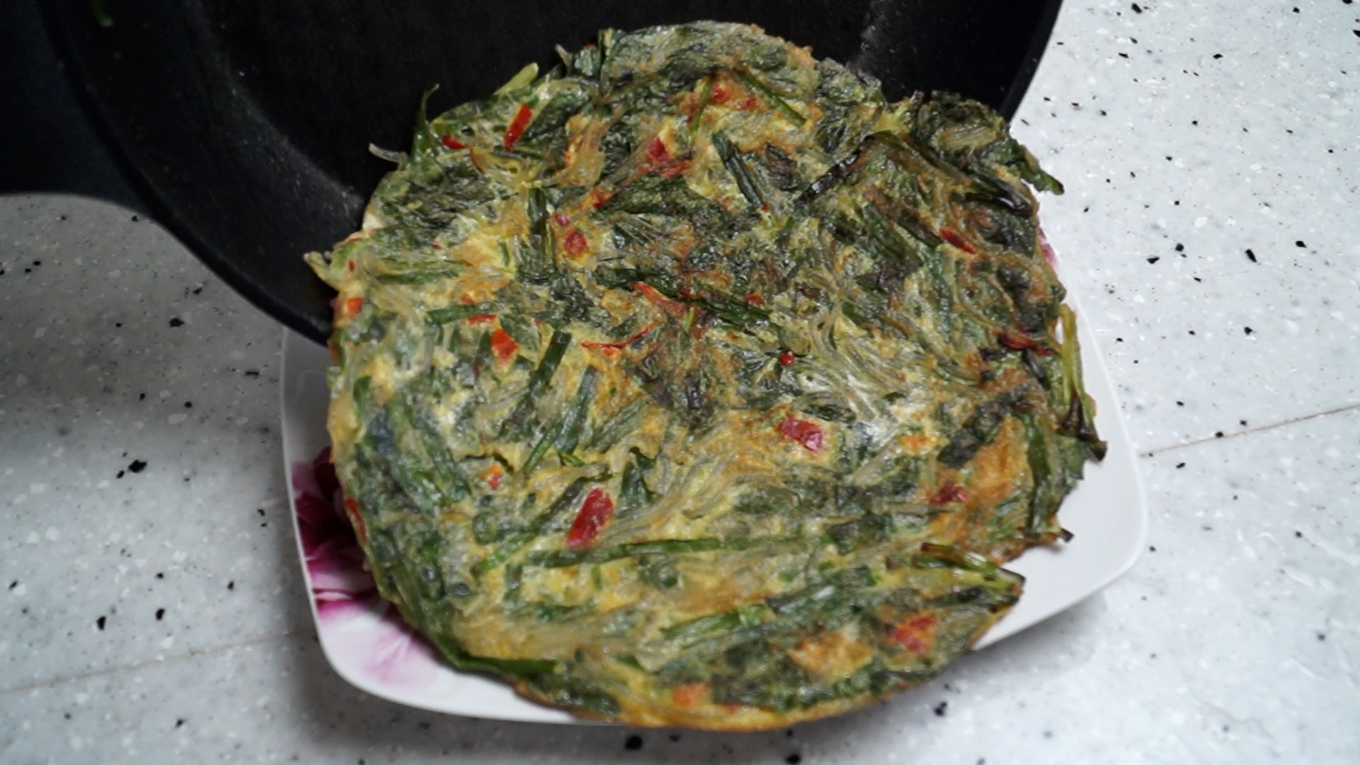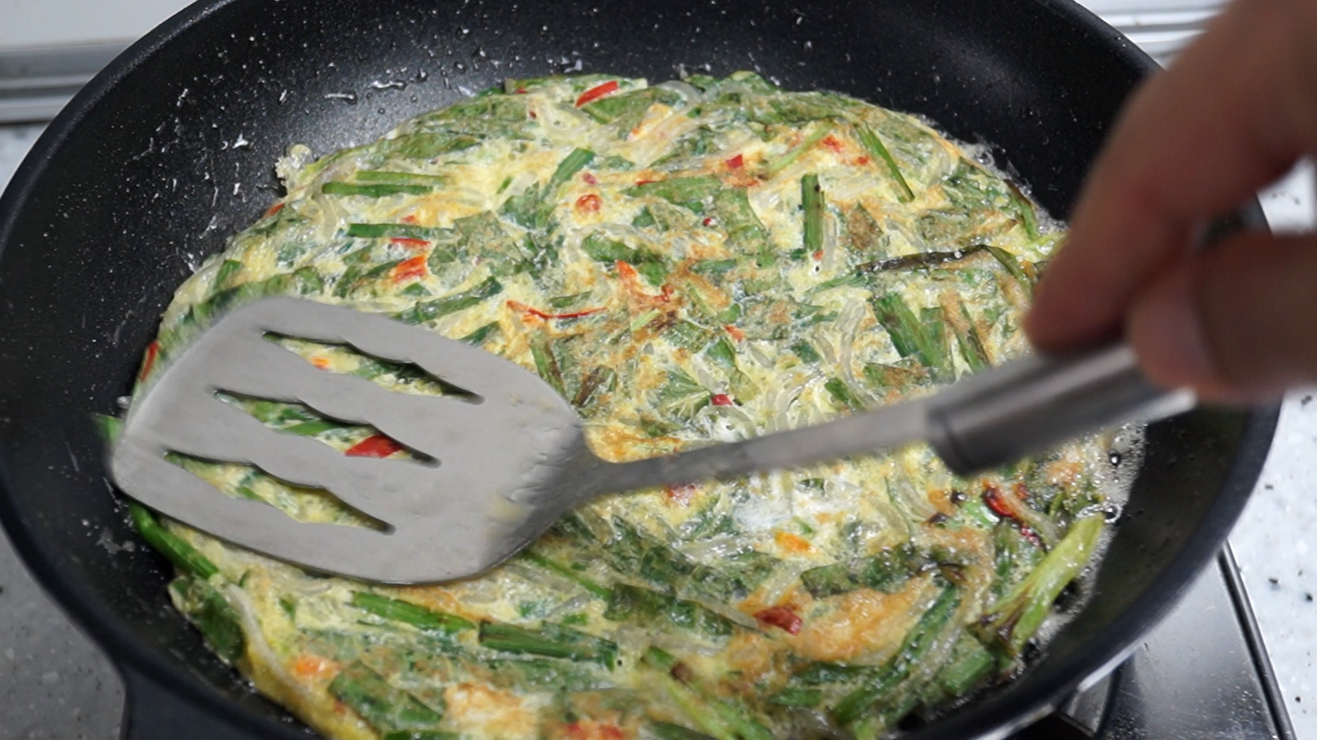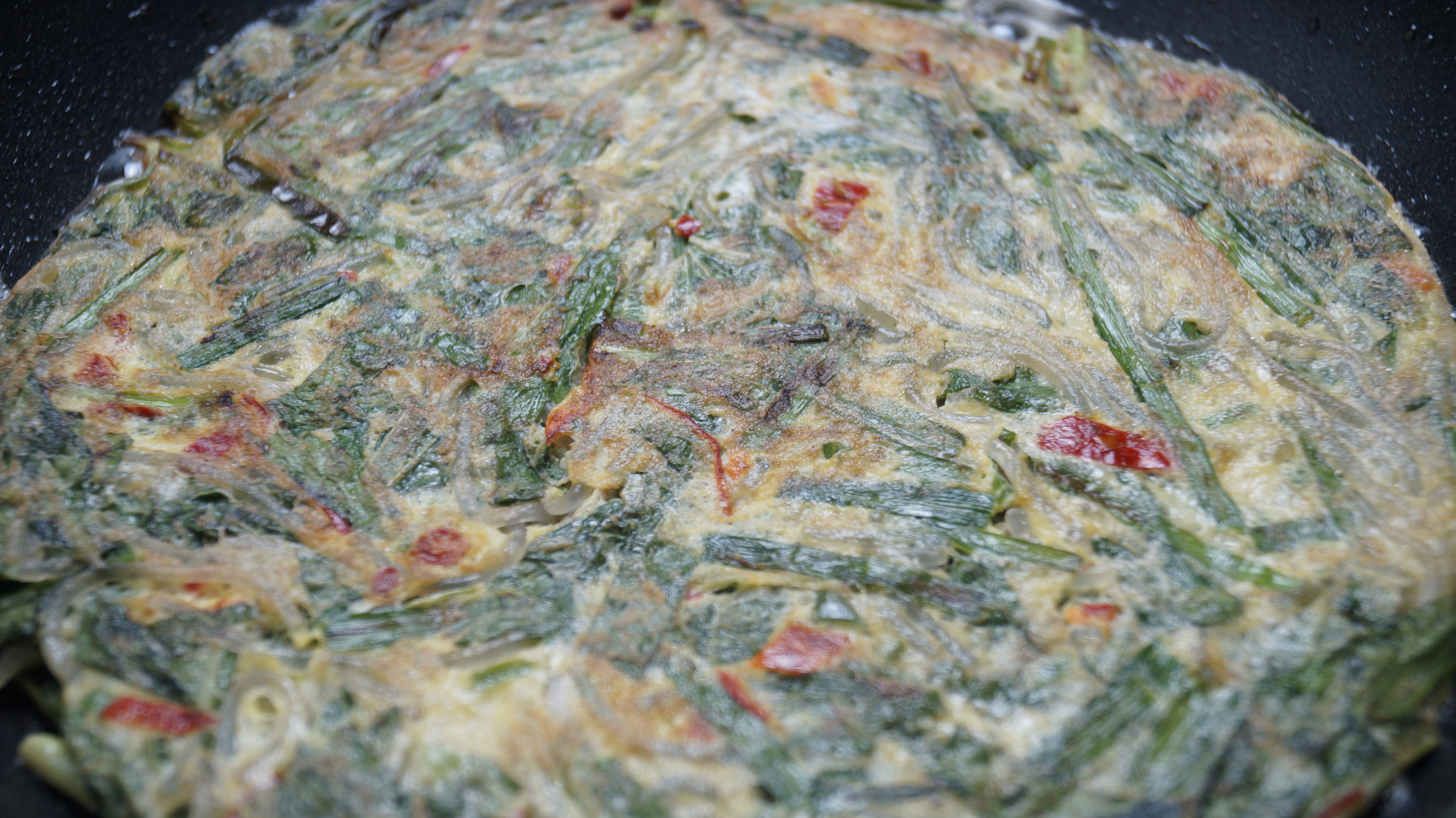 13. 저는 한방에 그냥 구워버렸습니다! 계란 만두 모양처럼 만드시려먼 부추를 좀더 잘게 잘라넣고 작게작게 펼쳐 접어가면서 구워 주시면 됩니다. 2분 정도 굽다 뒤집어주고 그 다음 부터는 1분 정도에 한번씩 2~3번을 뒤집어가며 구워주세요.