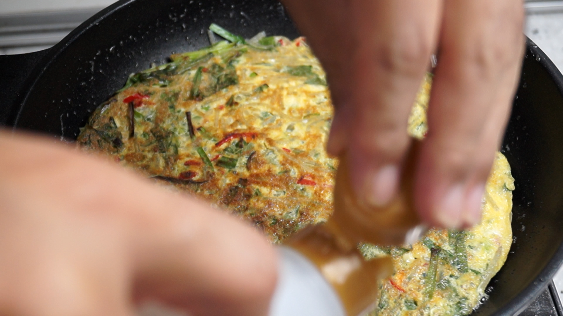 14. 뒤집은 다음에 팬 싸이드에 식용유가 너무 없어 보이면 식용유를 더 추가해주세요.