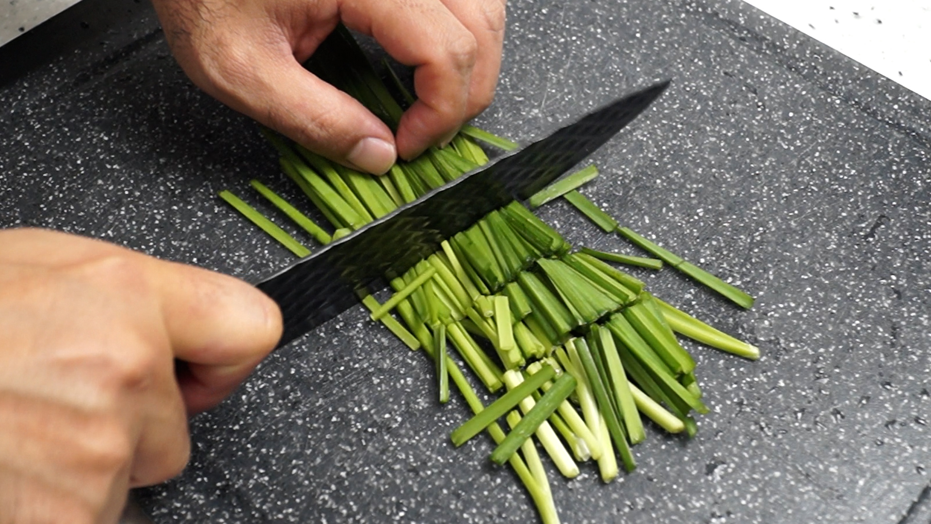 1. 부추 1줌을 2~3cm 크기로 잘라주세요. 무게가 애매하시면 3~4줄이 1줄기를 이루고 있는 부추로 12줄기 를 준비해보세요.